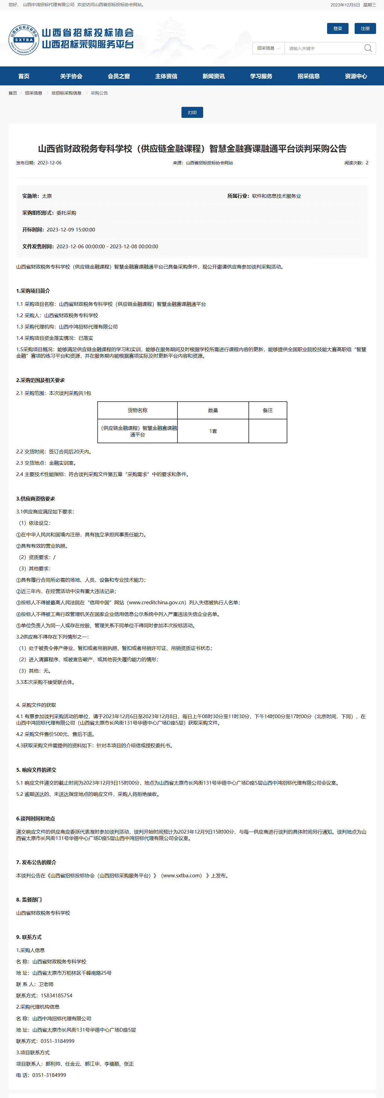 2023年12月6日,华夏城投项目管理有限公司受bat365委托,对bat365“(供应链金融课程)智慧金融赛课融通平台”项目发布谈判采购公告,山西省招投标网关于本项目公告如下:
