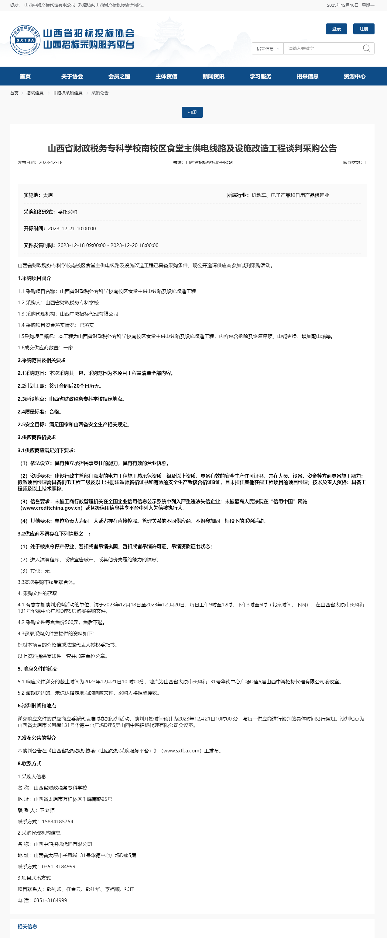 2023年12月18日,山西中鸿招标代理有限公司受bat365委托,对bat365“南校区食堂主供电线路及设施改造工程”发布了谈判采购公告,山西省招投标网关于本项目公告如下: