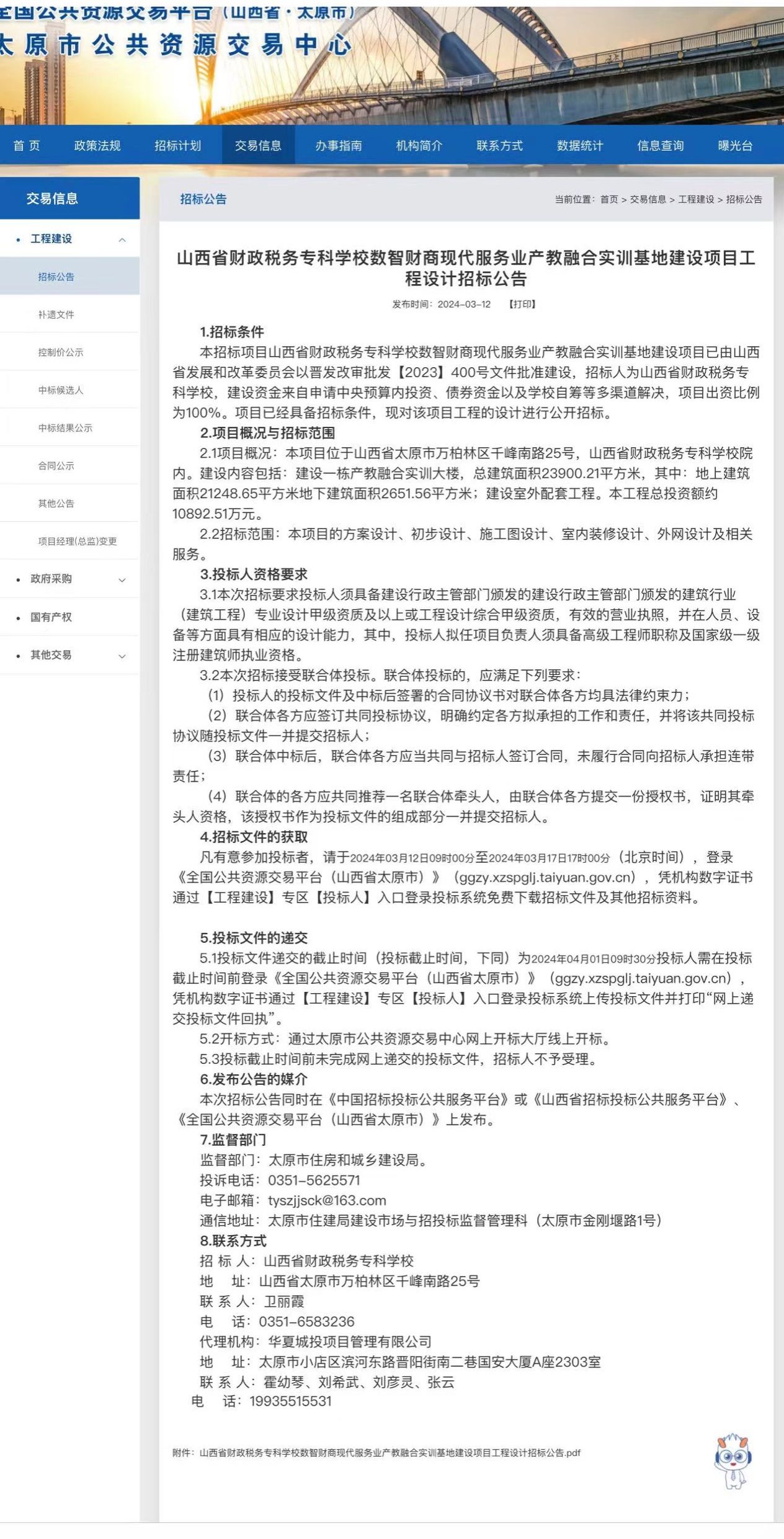 2024年3月12日,华夏城投项目管理有限公司受bat365委托,对bat365“数智财商现代服务业产教融合实训基地建设项目工程设计”发布了招标公告,太原市公共资源交易中心关于本项目公告如下: