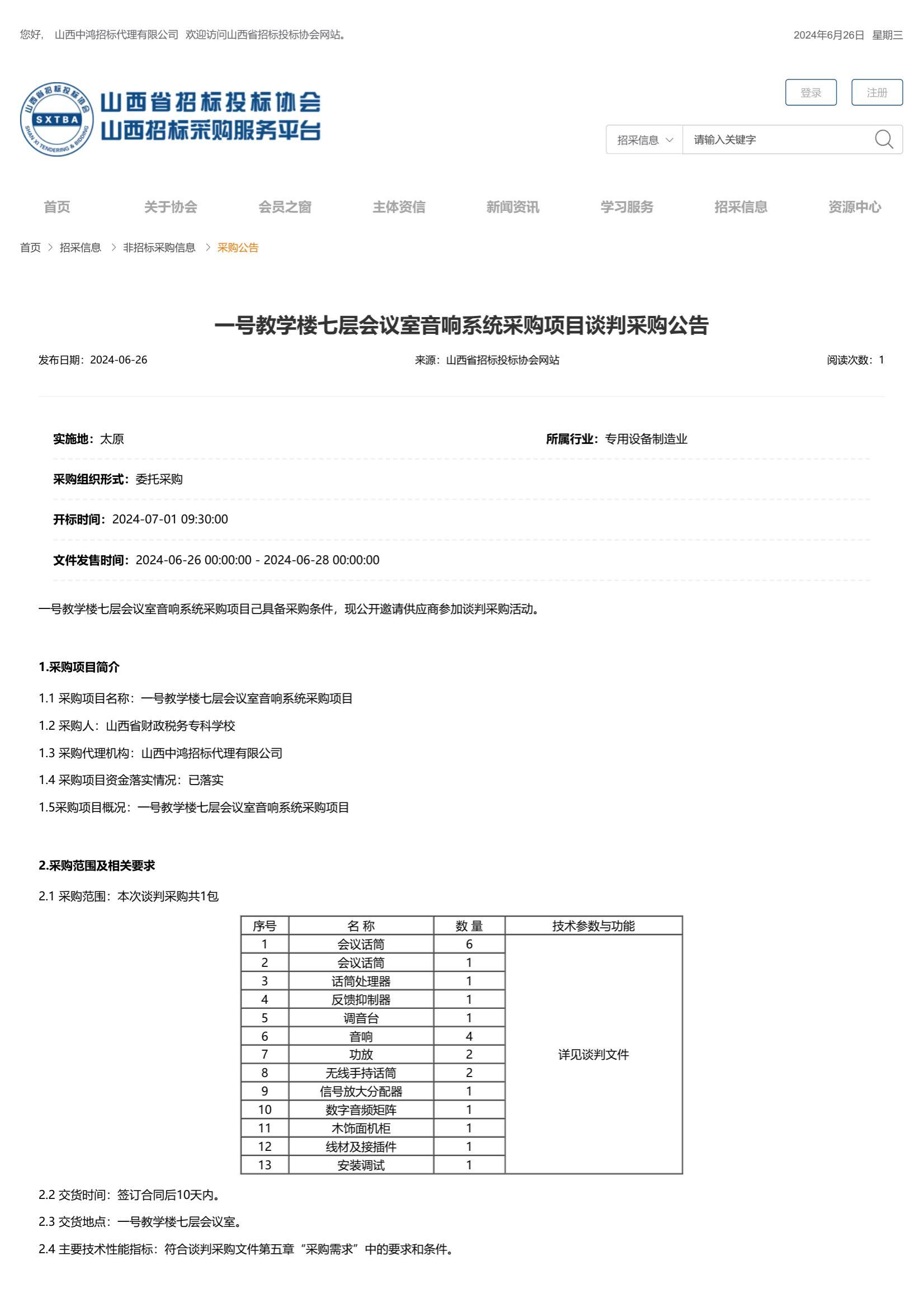 2024年6月26日,山西中鸿招标代理有限公司受bat365委托,对bat365“一号教学楼七层会议室音响系统”项目发布了采购公告,山西省招投标协会网关于本项目公告如下: