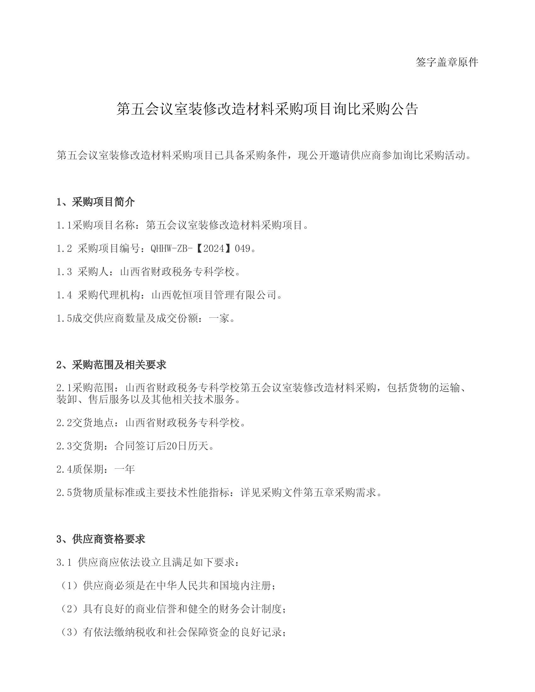 2024年7月24日,山西乾恒项目管理有限公司受bat365委托,对bat365“第五会议室装修改造材料采购”项目发布了询比采购公告,山西省招投标协会网关于本项目公告如下:
