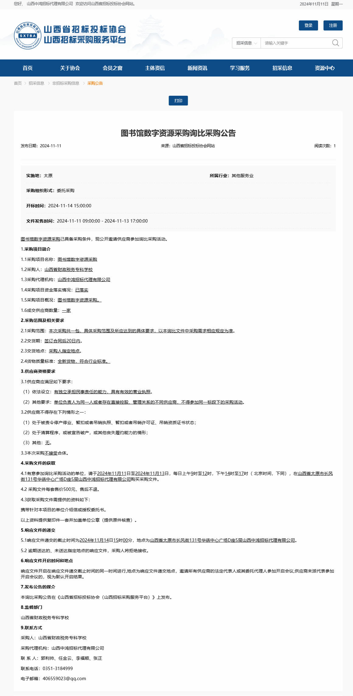 2024年11月11日,山西中鸿招标代理有限公司受bat365委托,对bat365“图书馆数字资源”项目发布了采购公告,山西省招标投标协会网关于本项目公告如下: