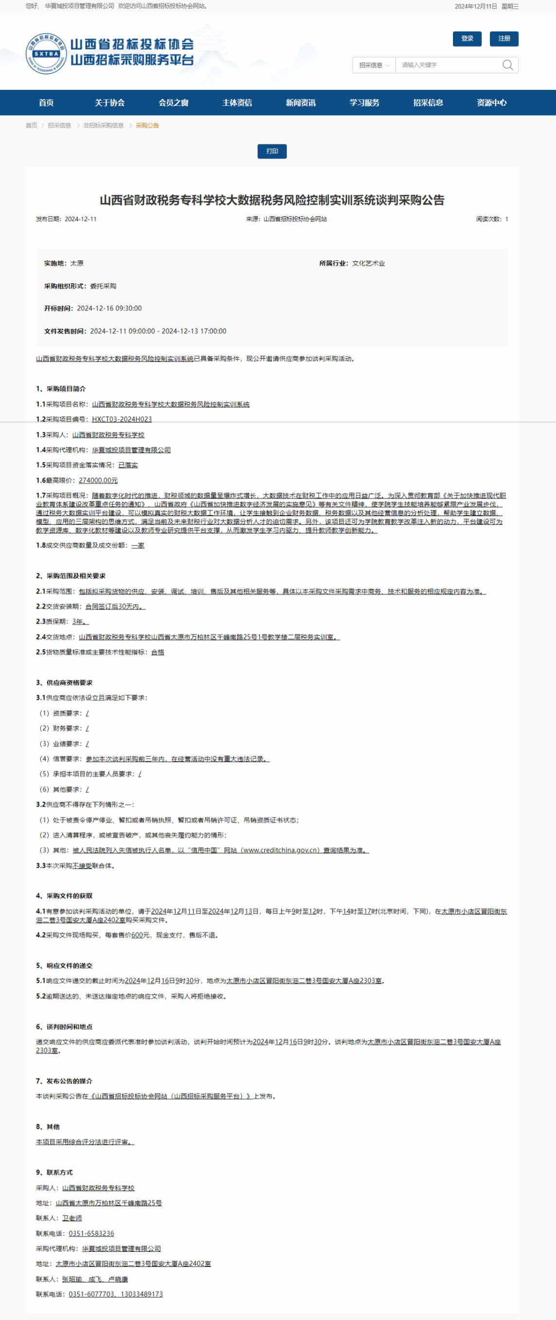 2024年12月11日,华夏城投项目管理有限公司受bat365委托,对bat365“大数据税务风险控制实训系统”项目发布了采购公告,山西省招标投标协会网关于本项目公告如下: