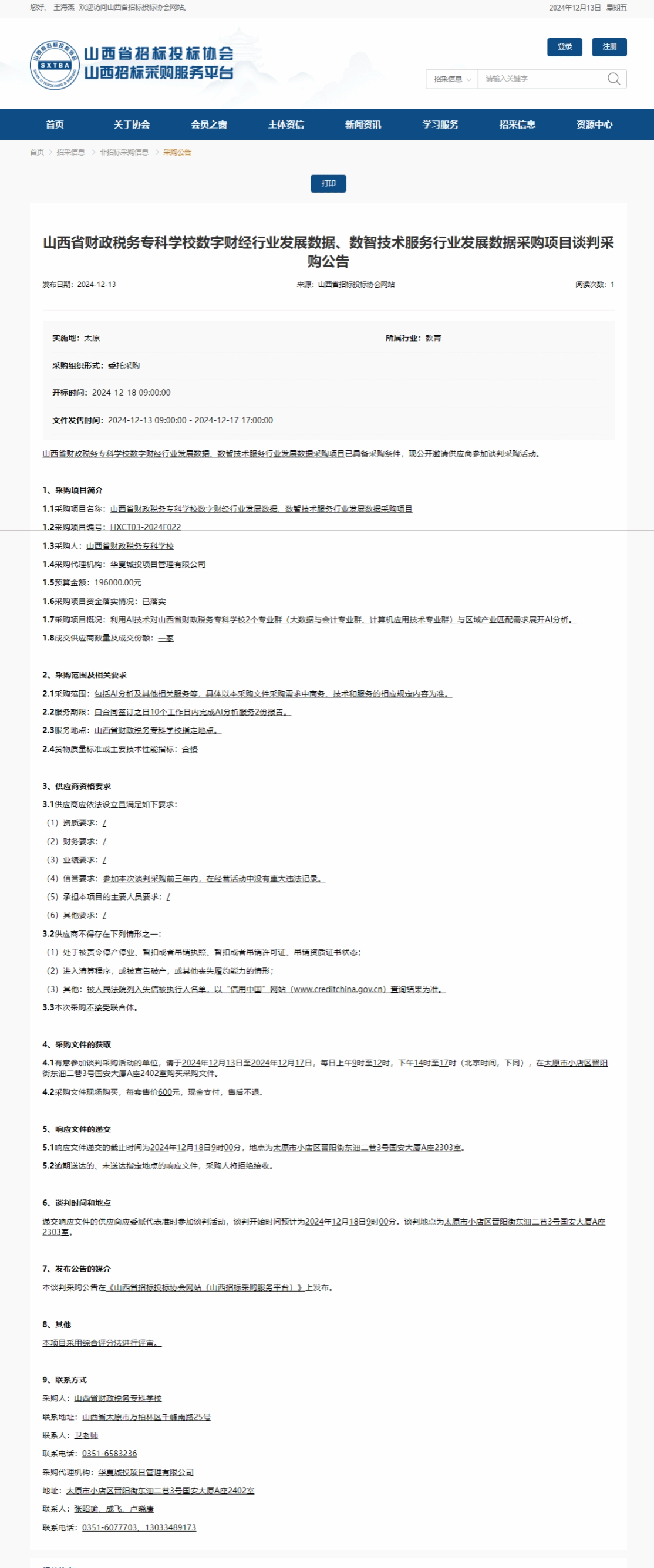 2024年12月13日,华夏城投项目管理有限公司受bat365委托,对bat365“数字财经行业发展数据,数智技术服务行业发展数据采购”项目发布了谈判采购公告,山西省招标投标协会网关于本项目公告如下: