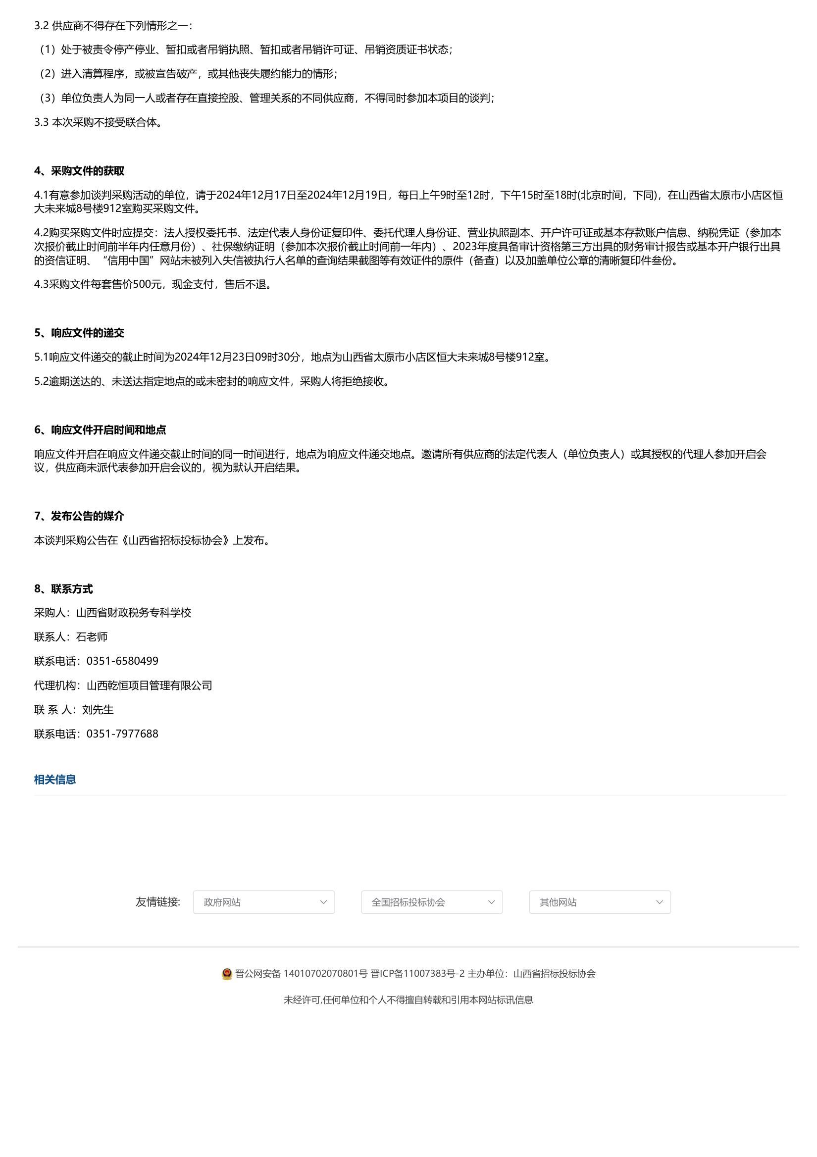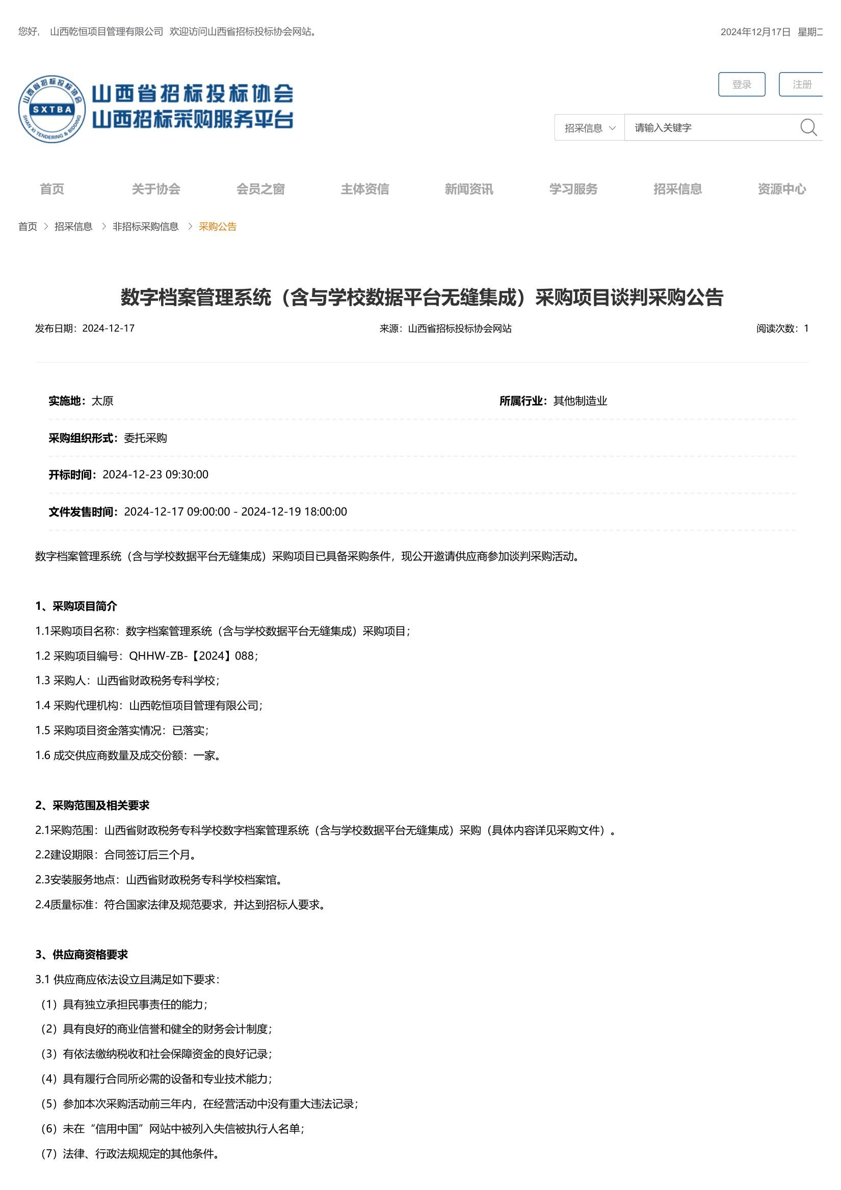 2024年12月17日,山西乾恒项目管理有限公司受bat365委托,对bat365“数字档案管理系统”项目发布了采购公告,山西省招标投标协会网关于本项目公告如下: