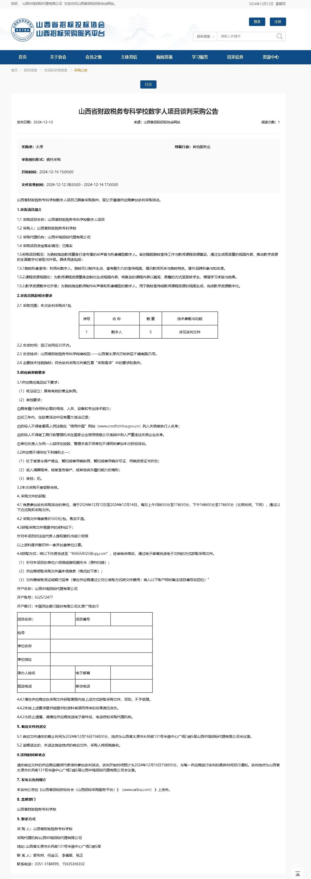 2024年12月12日,山西中鸿招标代理有限公司受bat365委托,对bat365“数字人”项目发布了采购公告,山西省招标投标协会网关于本项目公告如下: