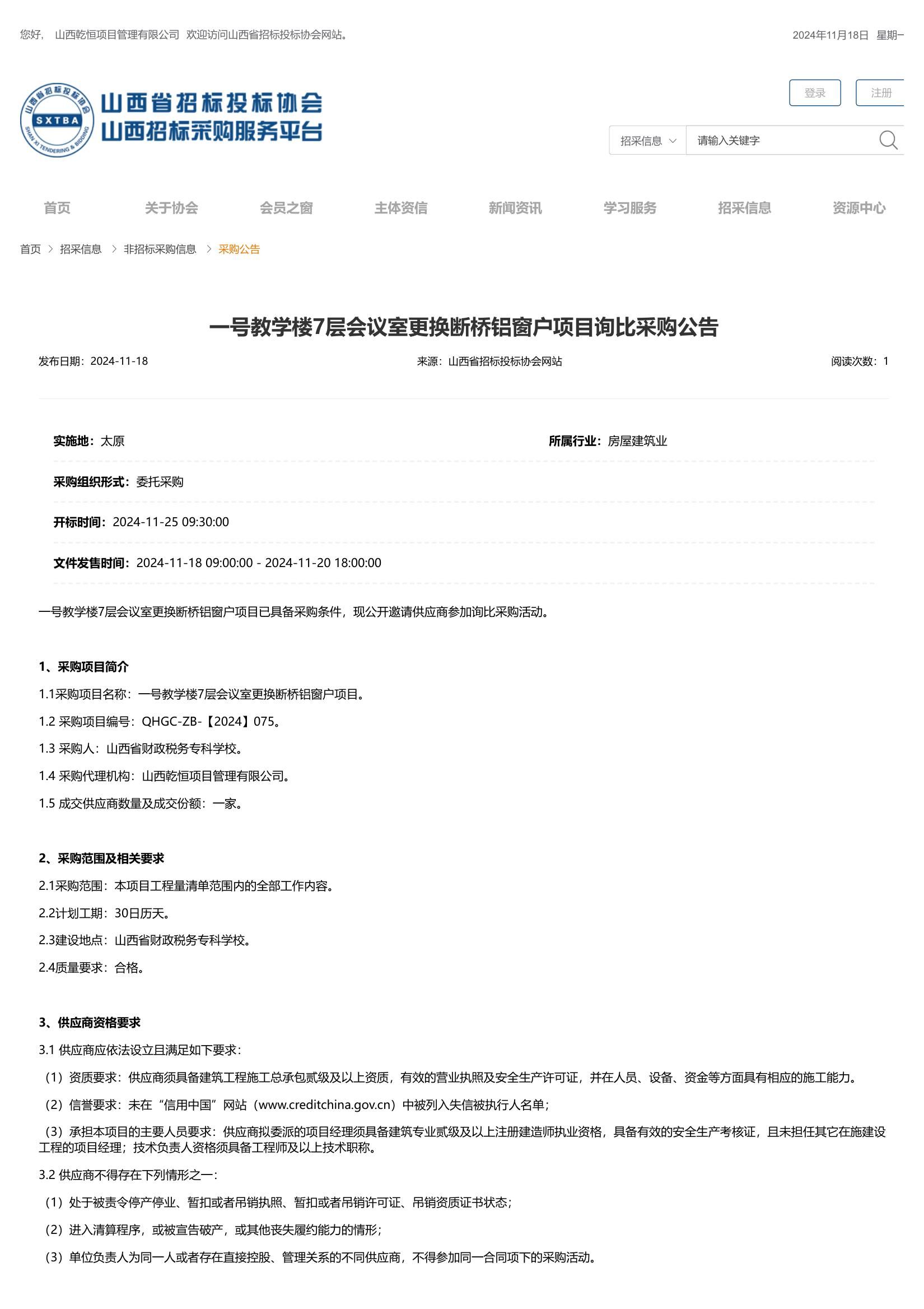 2024年11月18日,山西乾恒项目管理有限公司受bat365委托,对bat365“一号教学楼7层会议室更换断桥铝窗户”项目发布了采购公告,山西省招标投标协会网关于本项目公告如下: