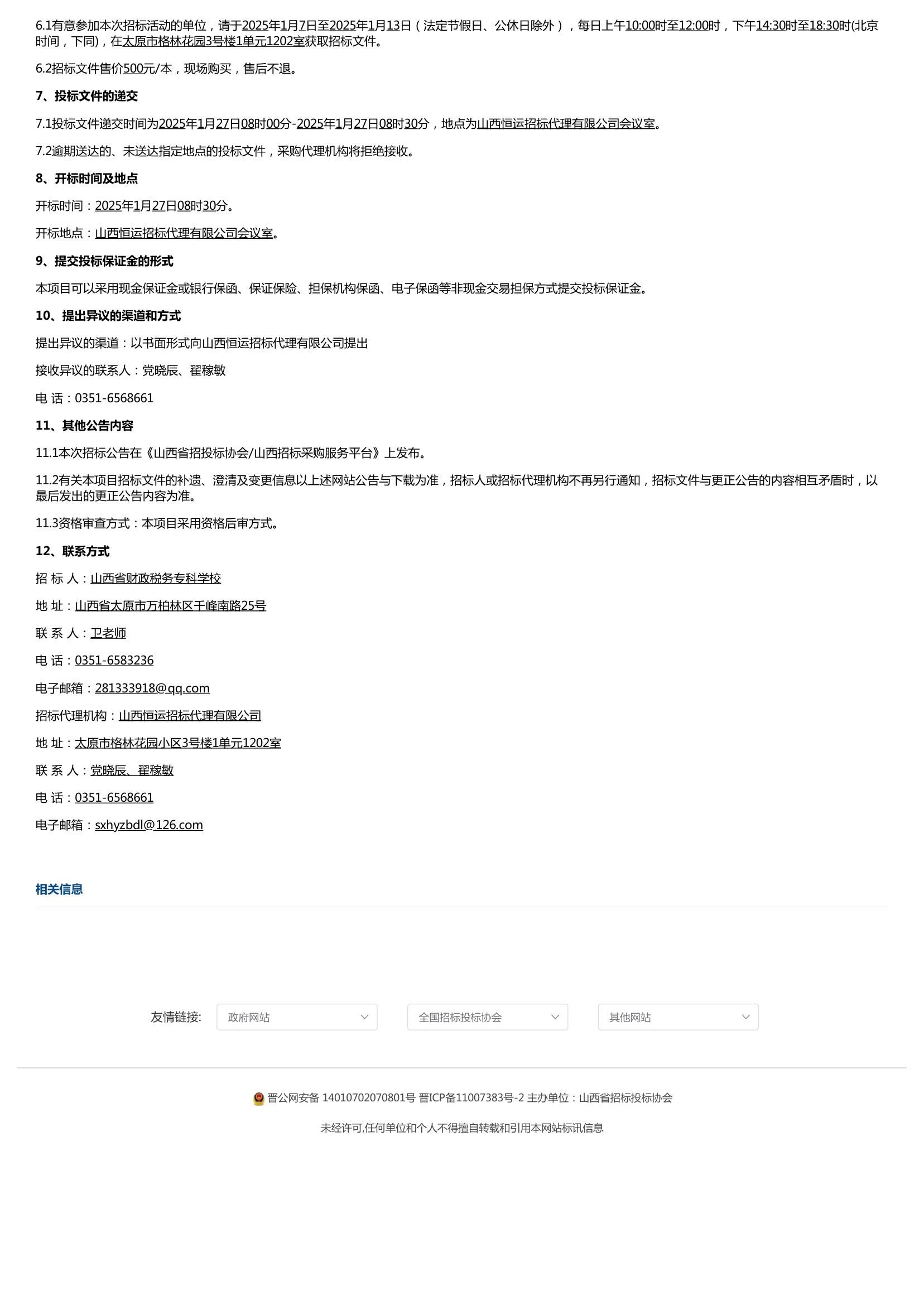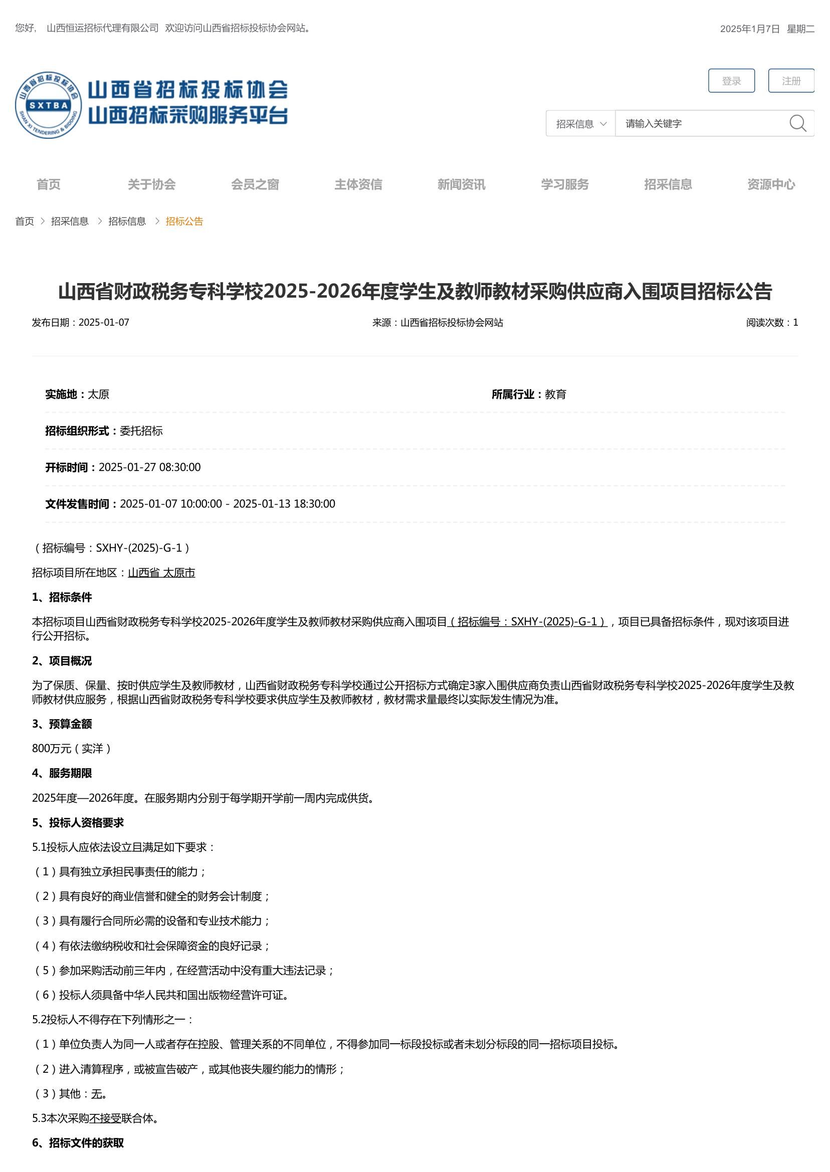 2025年1月7日,山西恒运招标代理有限公司受bat365委托,对bat365“2025-2026年度学生及教师教材采购供应商入围”项目发布了招标公告,山西省招标投标协会网关于本项目公告如下: