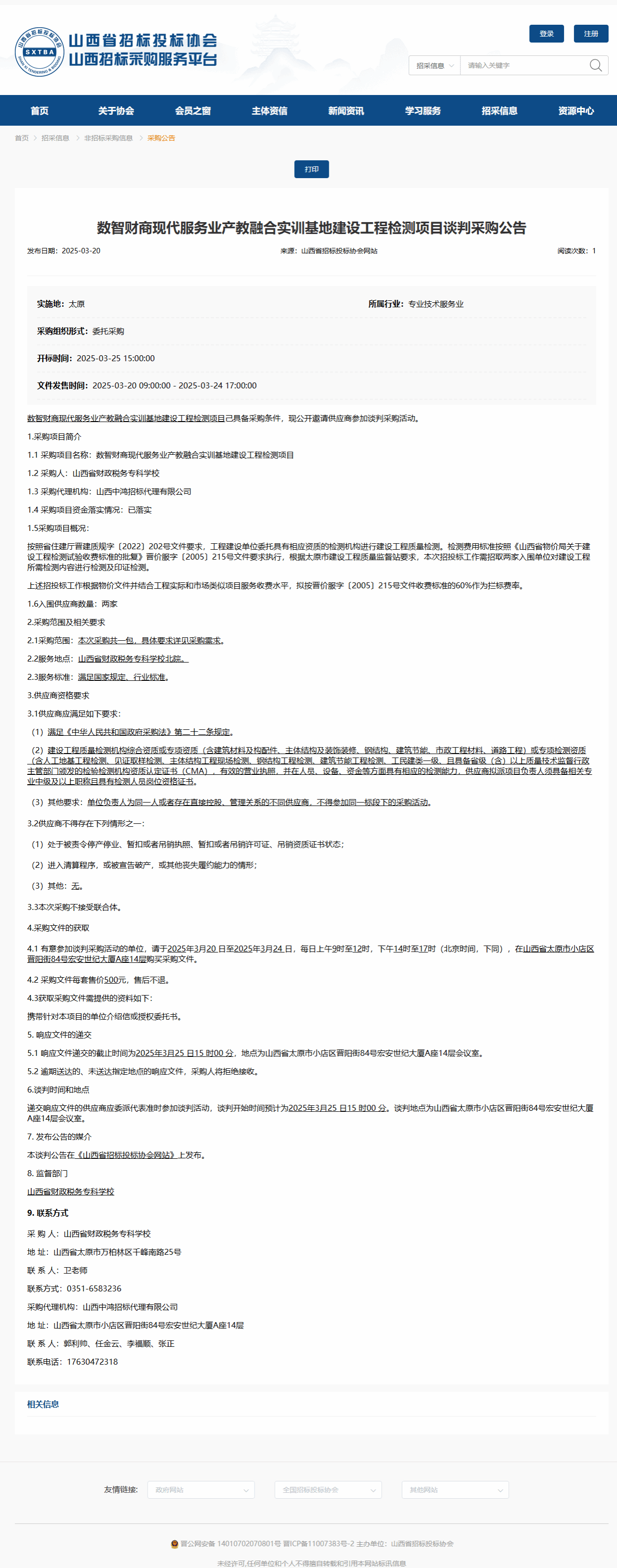 2025年3月20日,山西中鸿招标代理有限公司受bat365委托,对bat365“数智财商现代服务业产教融合实训基地建设工程检测”项目发布了采购公告,山西省招标投标协会网关于本项目公告如下: