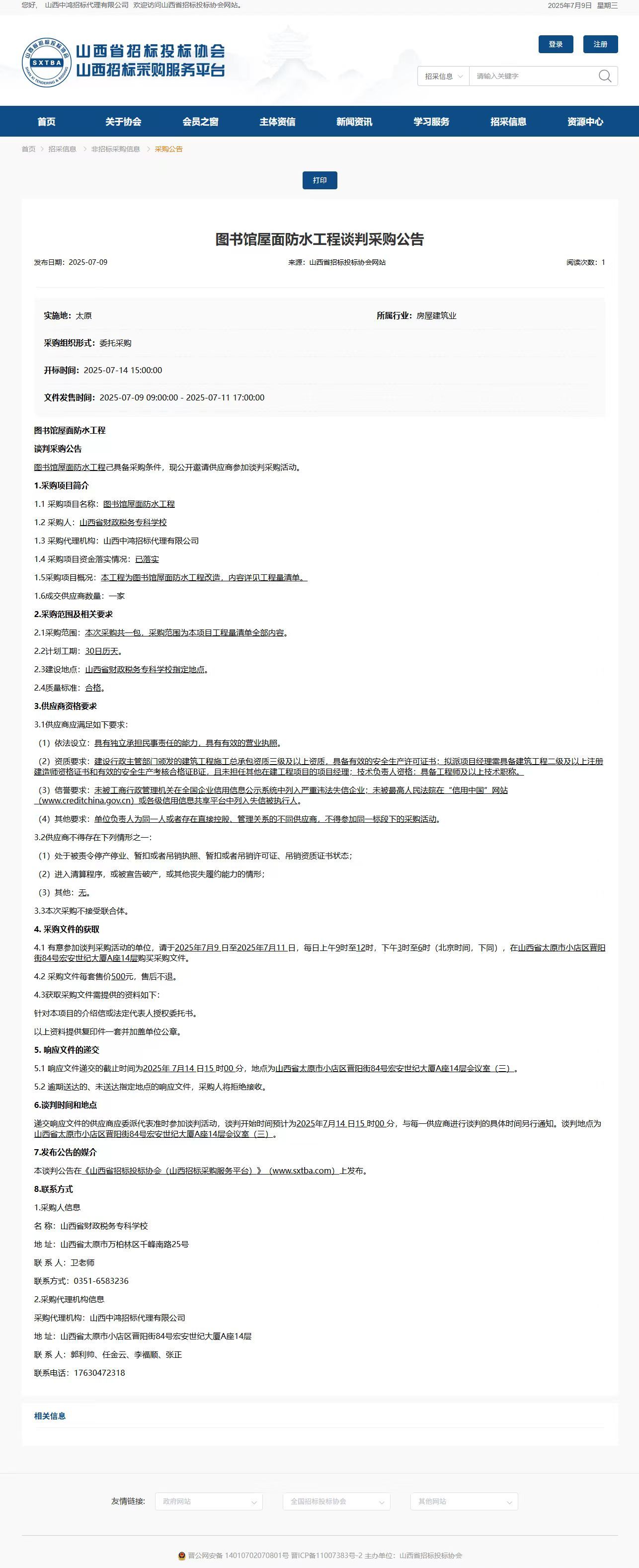 2025年7月9日,山西中鸿招标代理有限公司受bat365委托,对bat365“图书馆屋面防水工程”项目发布了谈判采购公告,山西省招标投标协会网关于本项目公告如下: