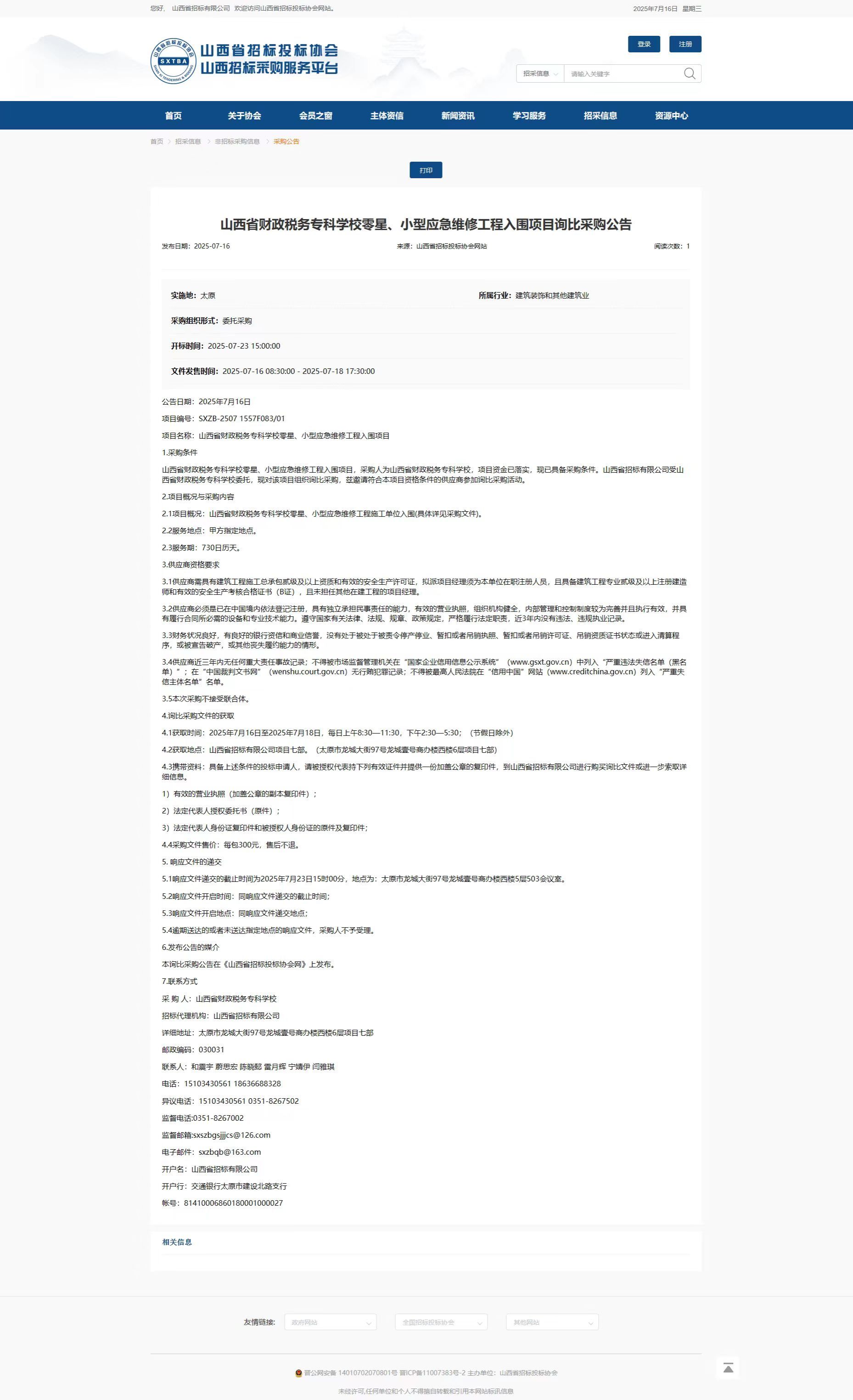 2025年7月16日,山西省招标有限公司受bat365委托,对bat365“零星、小型应急维修工程入围”项目发布了询比采购公告,山西省招标投标协会网关于本项目公告如下: