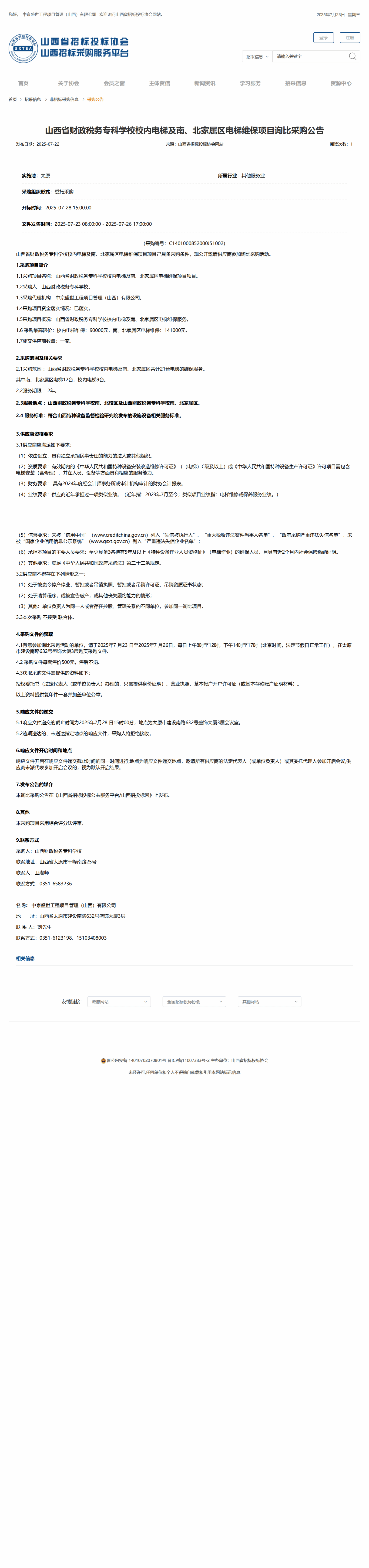 2025年7月22日,中京盛世工程项目管理(山西)有限公司受bat365委托,对bat365“校内电梯及南、北家属区电梯维保”项目发布了询比采购公告,山西省招标投标协会网关于本项目公告如下: