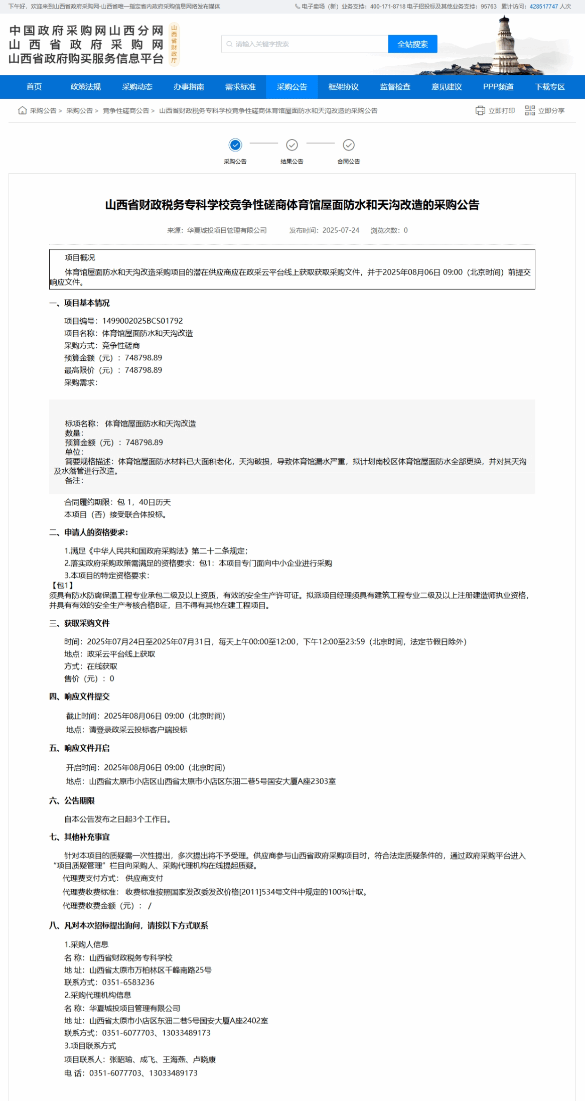 2025年7月24日,华夏城投项目管理有限公司受bat365委托,对bat365“体育馆屋面防水和天沟改造”项目发布了采购公告,山西省政府采购网关于本项目公告如下: