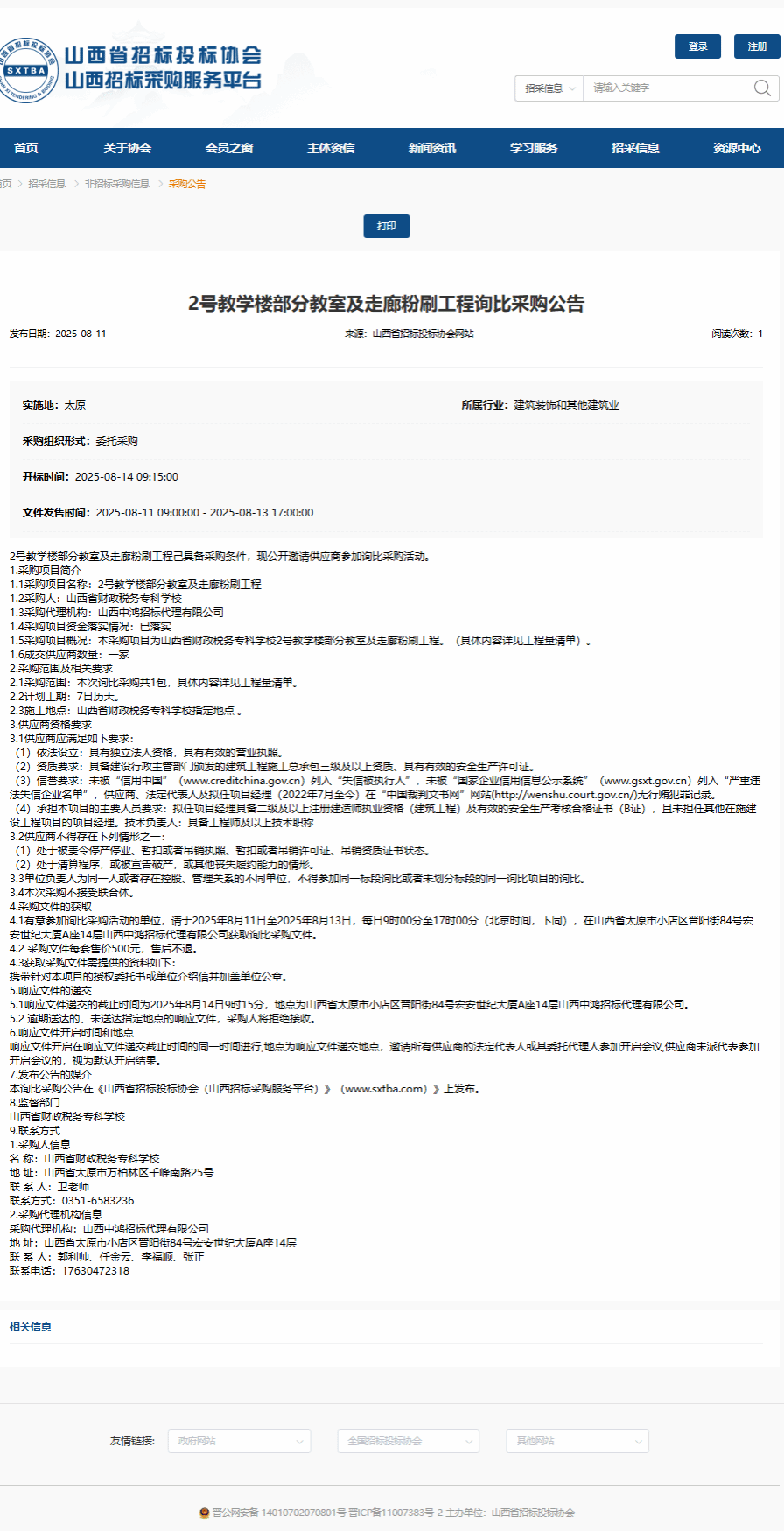 2025年8月11日,山西中鸿招标代理有限公司受bat365委托,对bat365“2号教学楼部分教室及走廊粉刷工程”项目发布了采购公告,山西省招标投标协会网关于本项目公告如下: