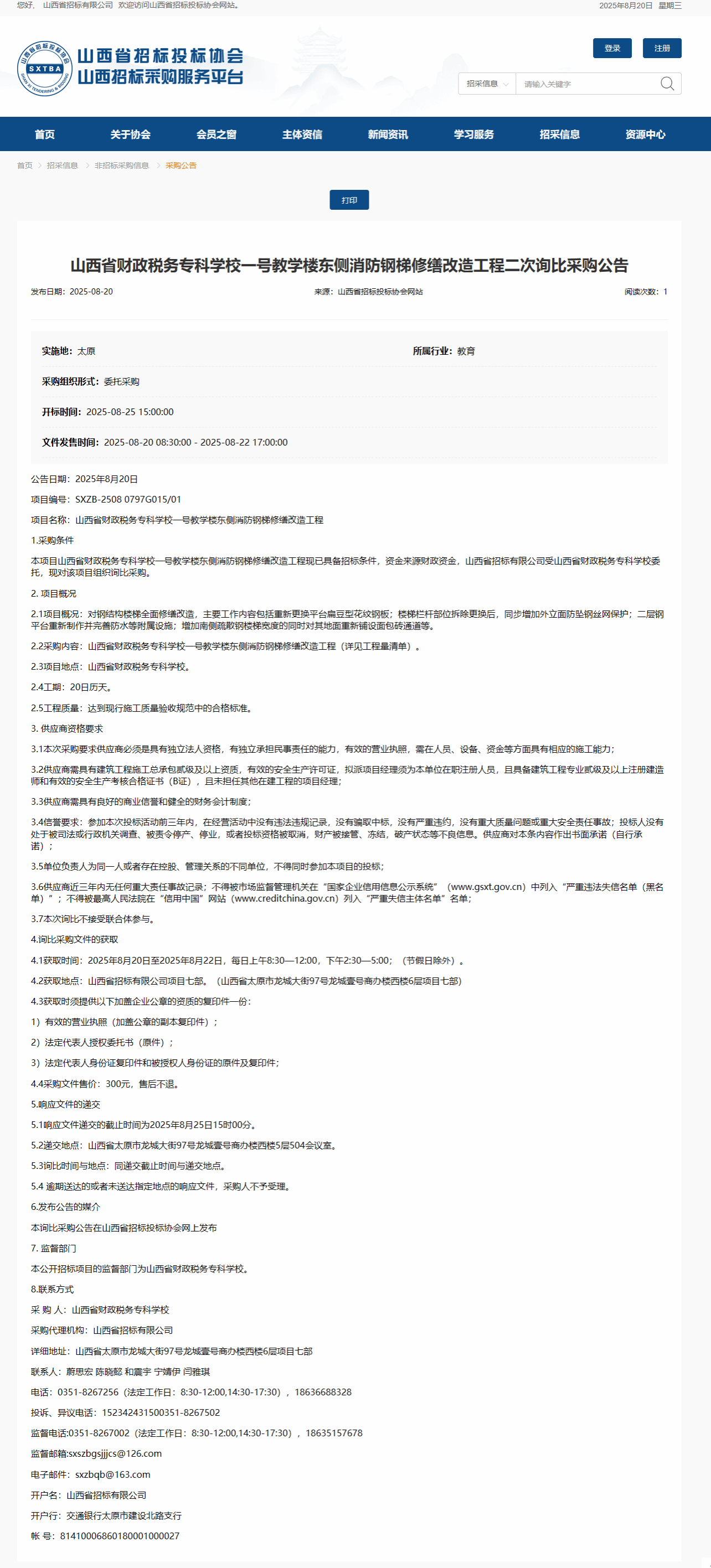 2025年8月20日,山西省招标有限公司受bat365委托,对bat365“一号教学楼东侧消防钢梯修缮改造工程”项目发布了采购公告,山西省招标投标协会网关于本项目公告如下:
