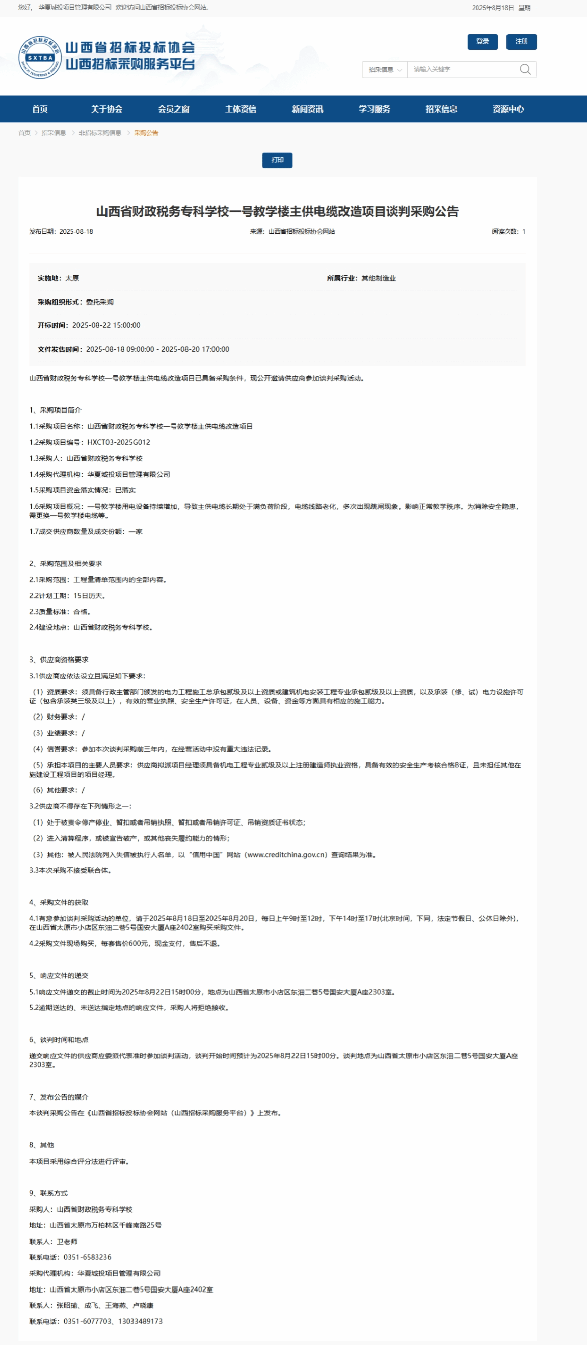 2025年8月18日,华夏城投项目管理有限公司受bat365委托,对bat365“一号教学楼主供电缆改造”项目发布了采购公告,山西省招标投标协会网关于本项目公告如下: