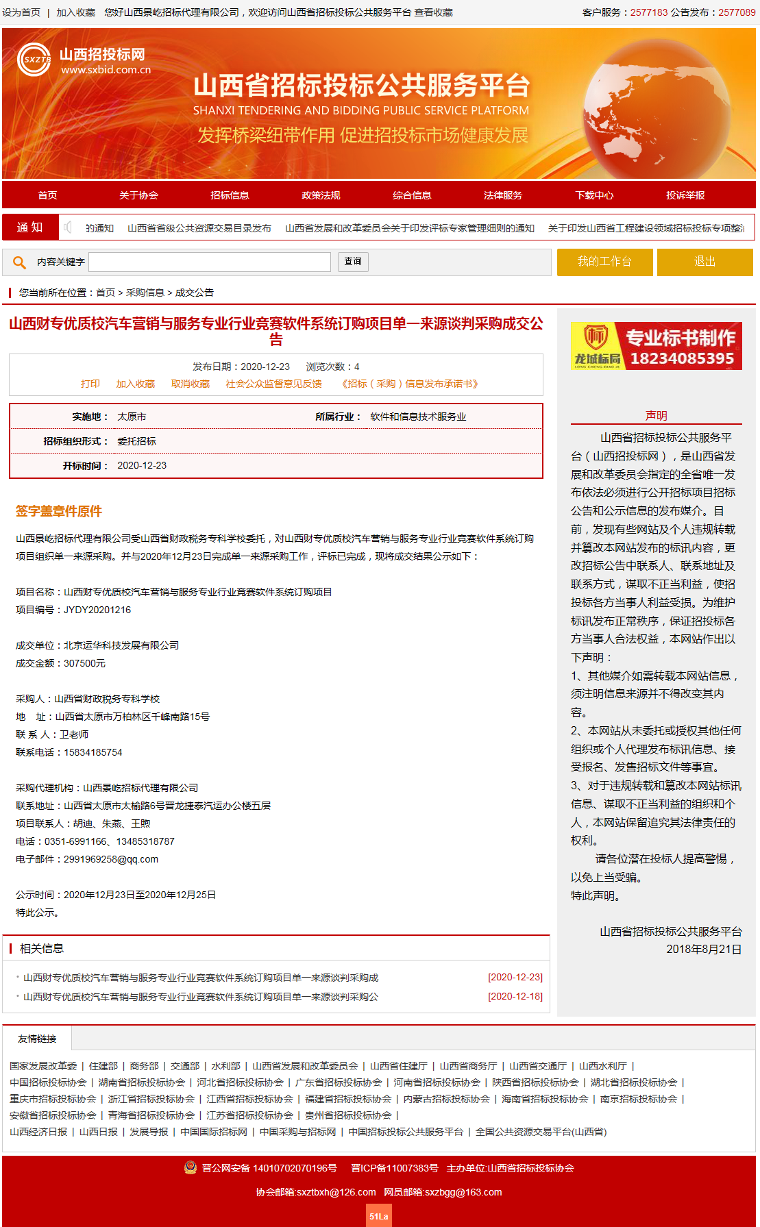 2020年12月23日,山西景屹招标代理有限公司受bat365委托,对bat365“汽车营销与服务专业行业竞赛软件系统”项目组织了单一来源采购,2020年12月23日对成交结果进行了公告。山西省招投标网关于本项目成交公告如下:
