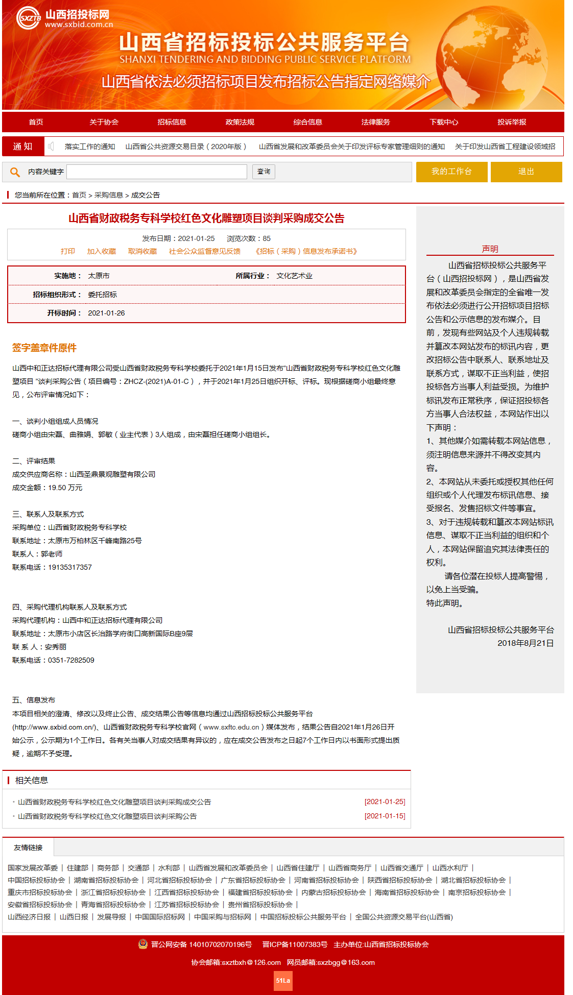 2021年1月26日,山西中和正达招标代理有限公司受bat365委托,对bat365“红色文化雕塑”项目组织了谈判采购,2021年1月26日对成交结果进行了公告。山西省招投标网关于本项目成交公告如下: