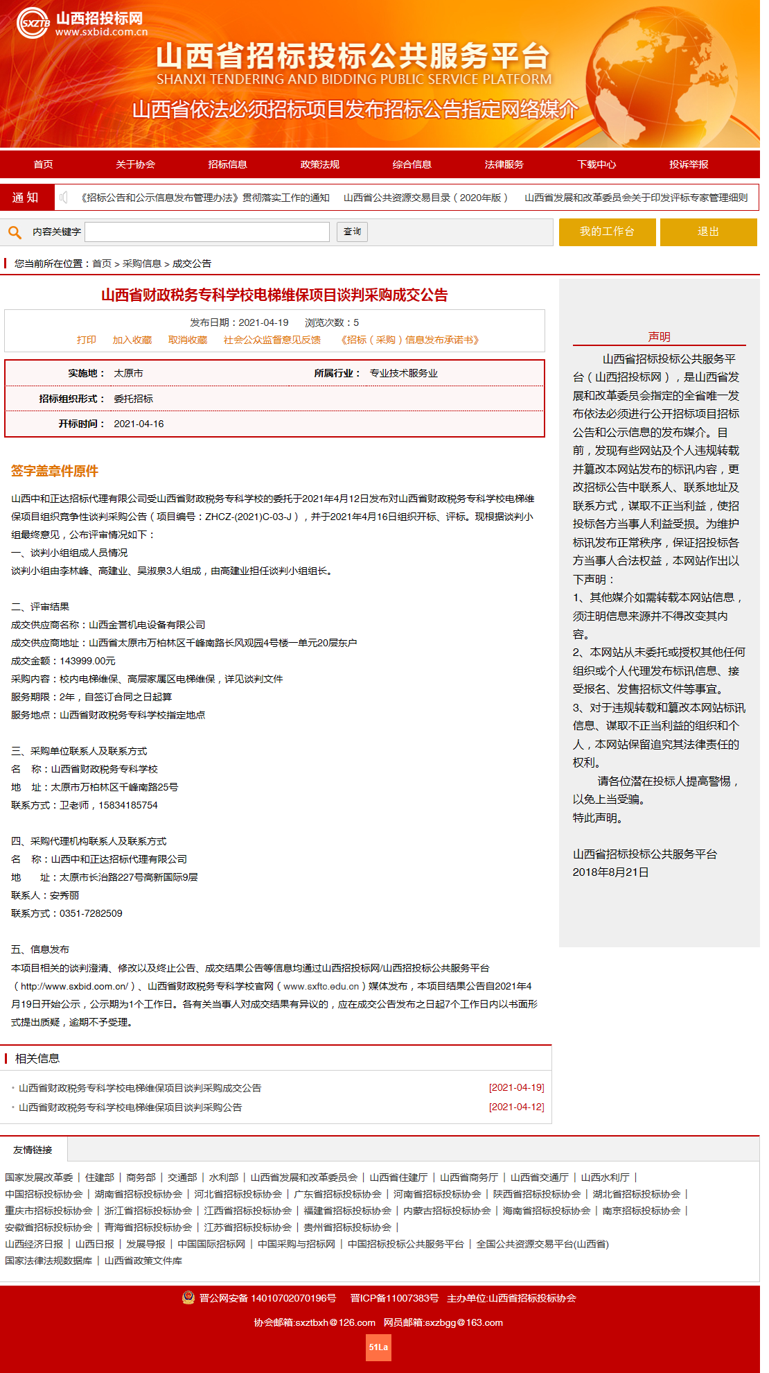 山西中和正达招标代理有限公司受bat365委托,对bat365“电梯维保”项目组织了竞争性谈判采购,并于2021年4月19日完成谈判采购工作,评标已完成,现将结果公示如下: