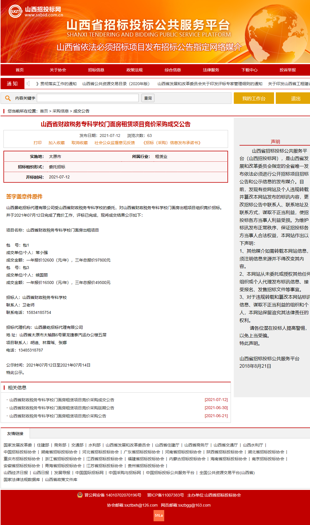 ,山西景屹招标代理有限公司受bat365委托,对bat365“门面房租赁”项目组织竞价招标,现将结果公示如下: