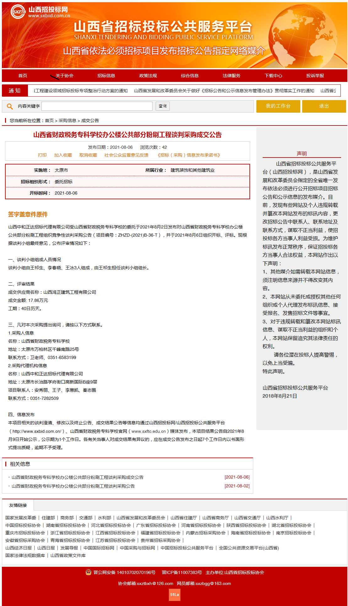 2021年8月6日,山西中和正达招标代理有限公司受bat365委托,对bat365“办公楼公共部分粉刷工程”项目组织了竞标、评标,2021年8月6日对成交结果进行了公告。山西省招投标网关于本项目成交公告如下: