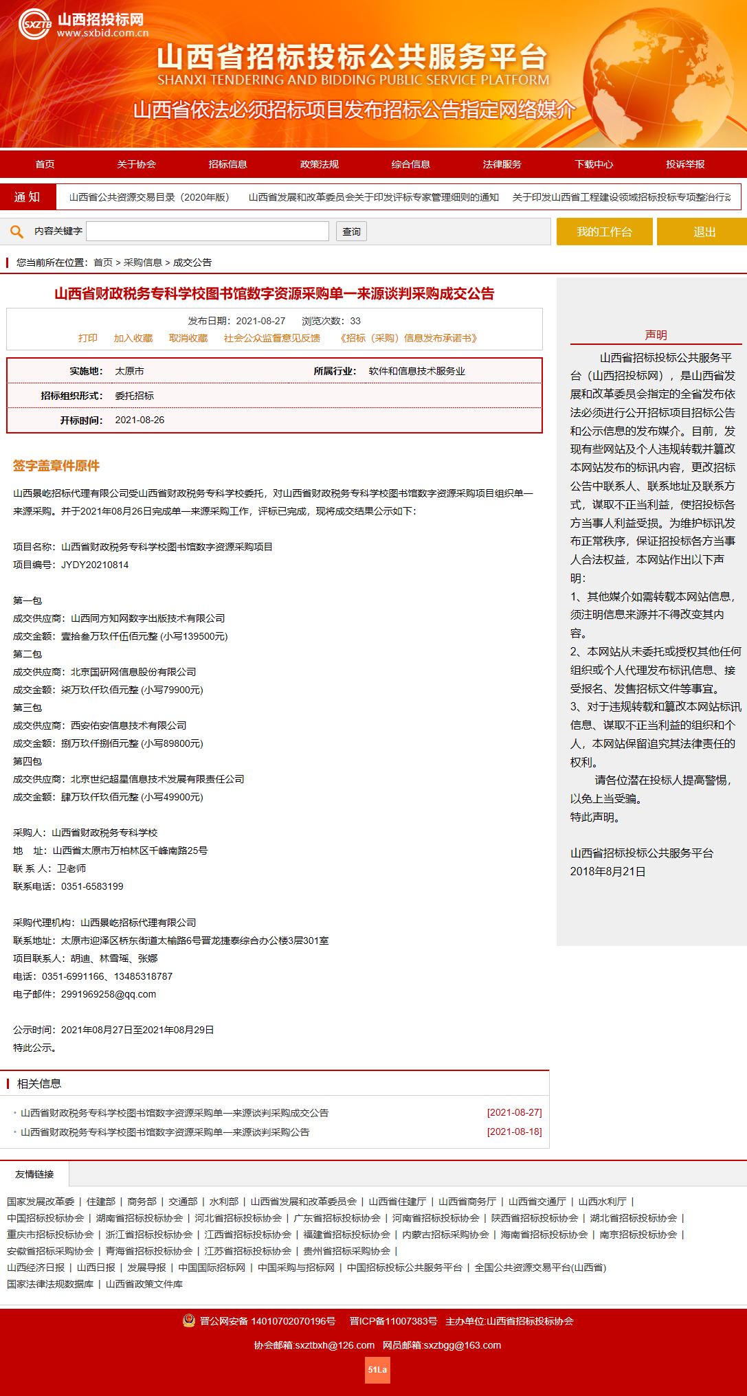2021年8月26日,山西景屹招标代理有限公司受bat365委托,对bat365“图书馆数字资源”项目组织了单一来源采购及评标,2021年8月27日对成交结果进行了公告。山西省招投标网关于本项目成交公告如下: