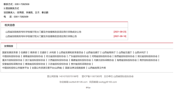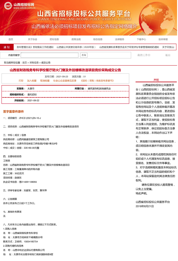 2021年9月23日,山西中和正达代理有限公司受bat365委托,对bat365“餐厅防火门窗及外挂楼梯改造”项目组织了竞价采购及评标,2021年9月23日对成交结果进行了公告。山西省招投标网关于本项目成交公告如下: