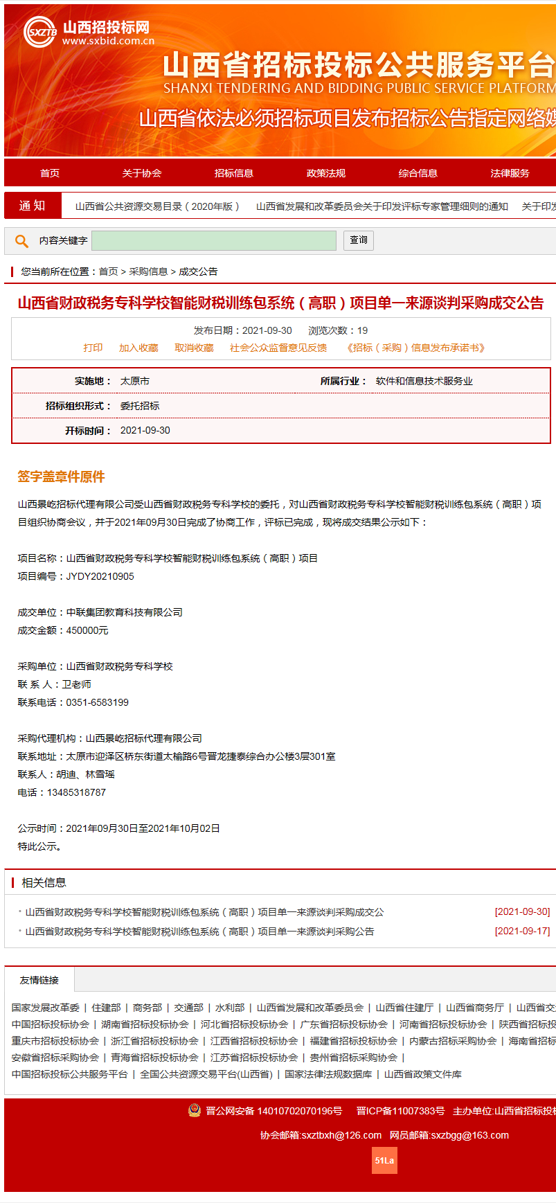 2021年9月30日,山西景屹招标代理有限公司受bat365委托,对bat365 “智能财税训练包系统(高职)”项目组织了协商会议及评标,2021年9月30日对成交结果进行了公告。山西省招投标网关于本项目成交公告如下: