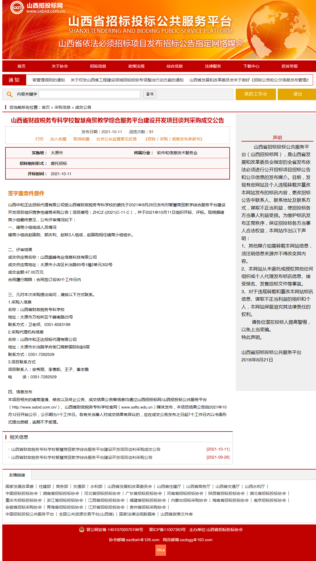 2021年10月11日,山西中和正达招标代理有限公司受bat365委托,对bat365“智慧商贸教学综合服务平台建设开发”项目组织了开标、评标,2021年10月11日对成交结果进行了公告。山西省招投标网关于本项目成交公告如下: