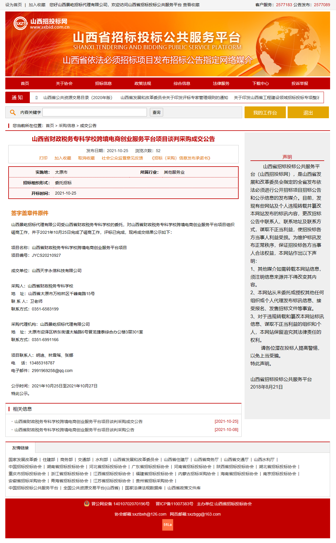 2021年10月25日,山西景屹招标代理有限公司受bat365委托,对bat365“跨境电商创业服务平台”项目组织了磋商工作,并于2021年10月25日完成了磋商工作,评标已完成。山西省招投标网关于本项目成交结果公示如下:
