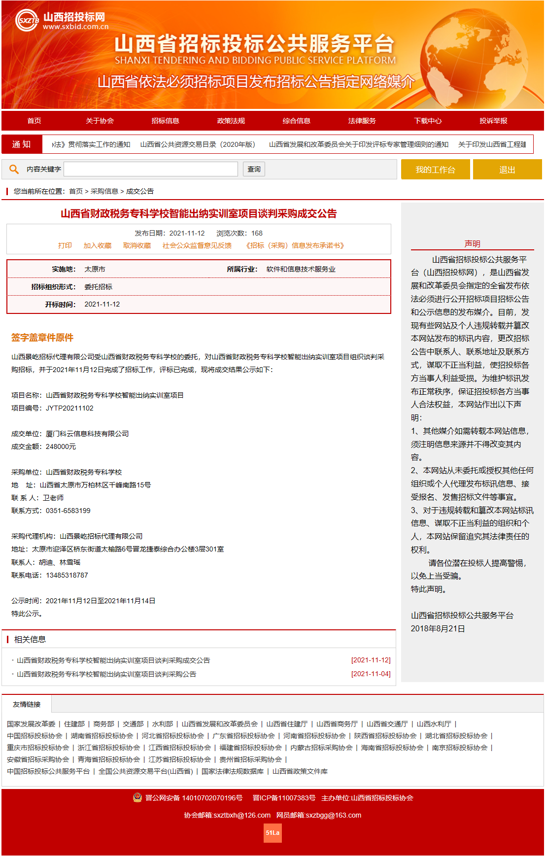 2021年11月12日,山西景屹招标代理有限公司受bat365委托,对bat365“智能出纳实训室”项目组织了谈判采购工作,并于2021年11月12日组织开标、评标。山西省招投标网关于本项目成交结果公示如下: