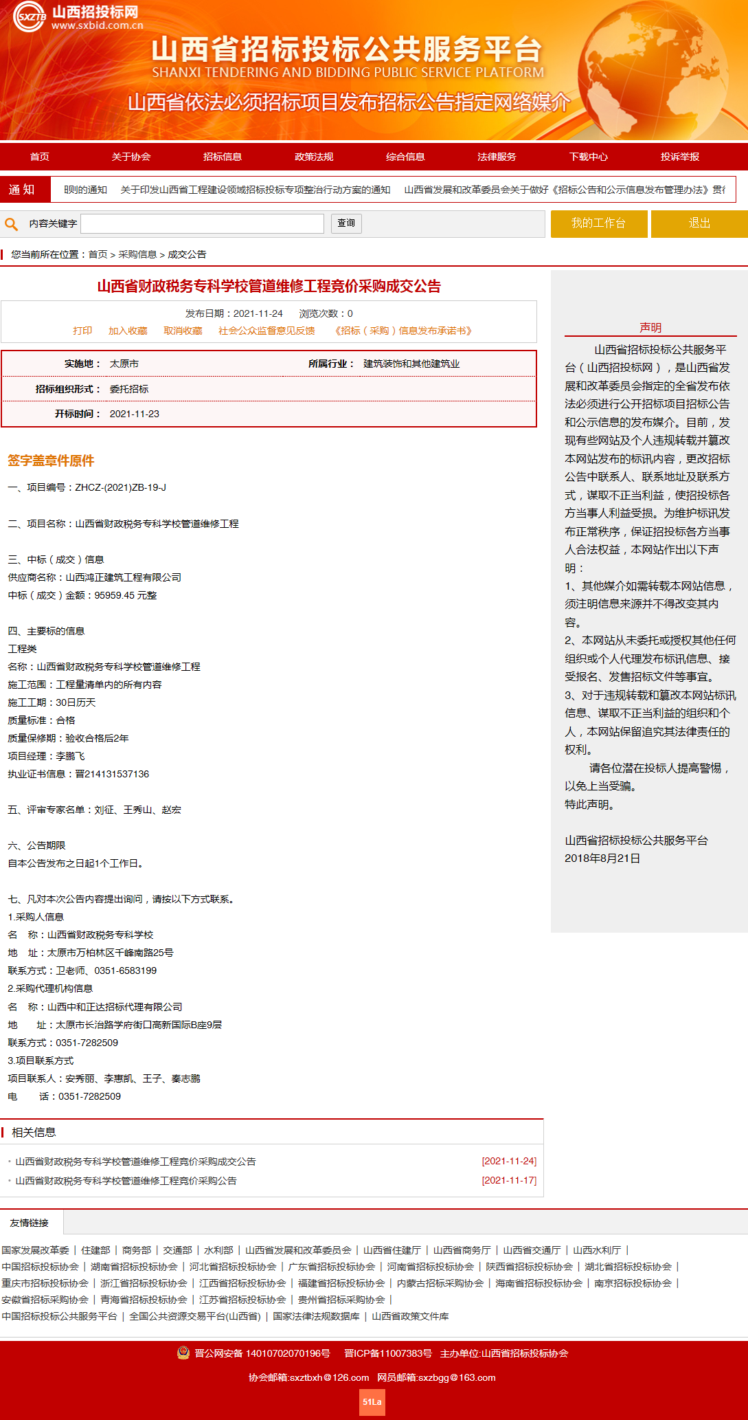 2021年11月24日,山西中和正达招标代理有限公司受bat365委托,对bat365“管道维修”工程组织了竞价采购工作,并于2021年11月24日组织开标、评标。山西省招投标网关于本项目成交结果公示如下: