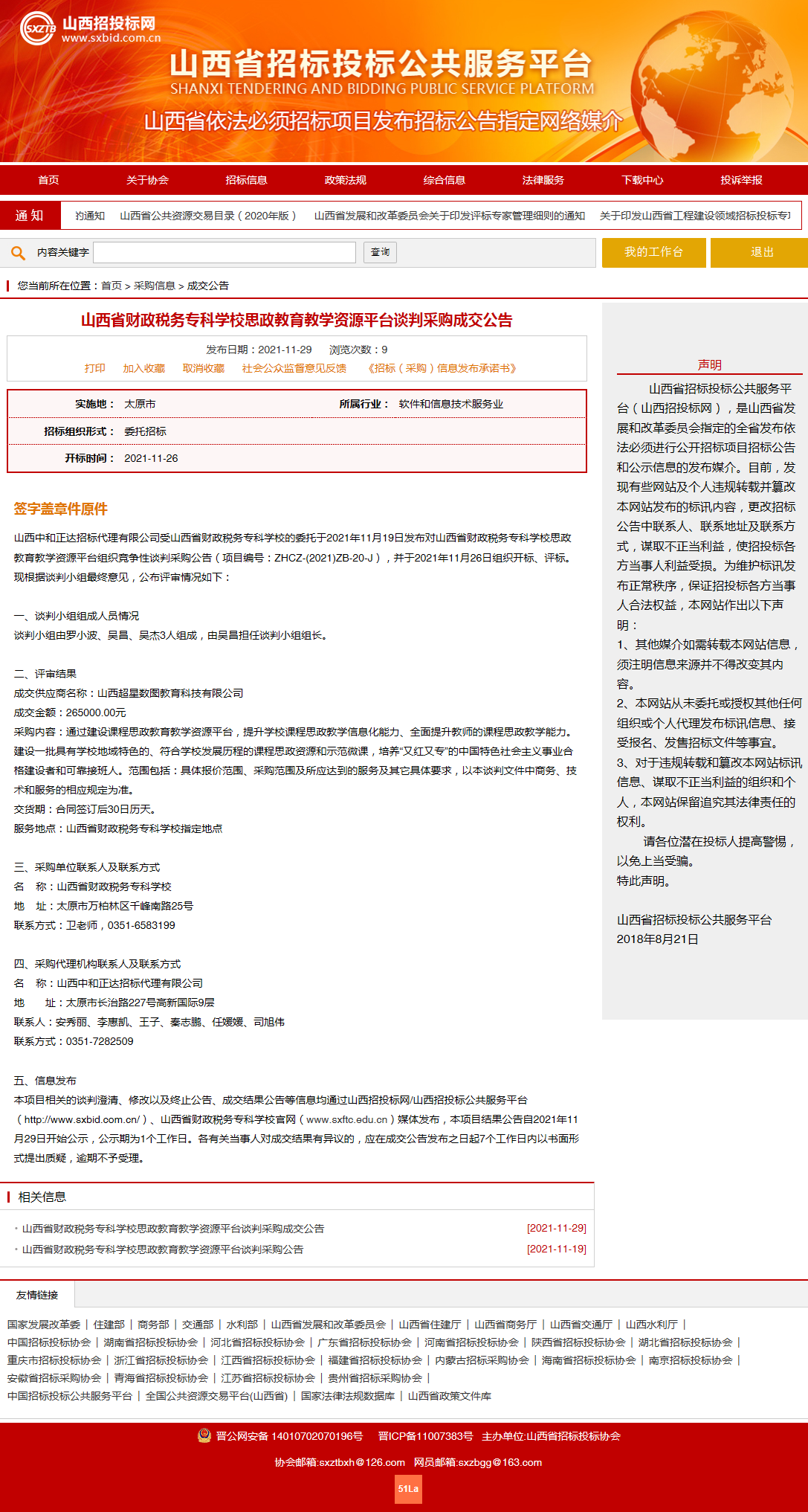 2021年11月26日,山西中和正达招标代理有限公司受bat365委托,对bat365“思政教育教学资源平台”项目组织了竞争性谈判采购工作,并于2021年11月26日组织开标、评标。山西省招投标网关于本项目成交结果公示如下: