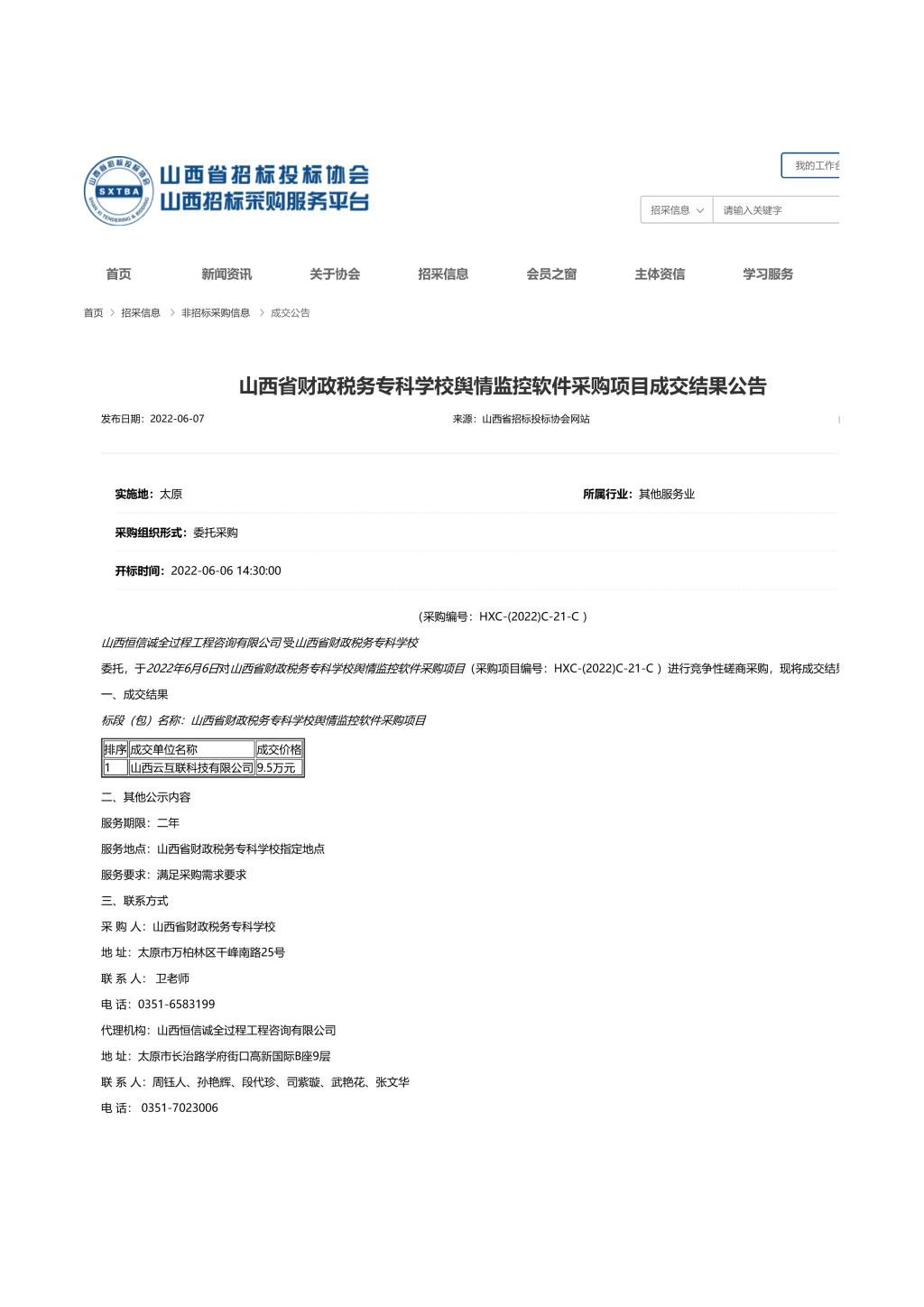 2022年6月7日,山西恒信诚全过程工程咨询有限公司受bat365委托,对bat365“舆情监控软件采购”项目进行竞争性磋商采购,并于2022年6月6日组织开标、评标。山西省招标采购服务平台关于本项目成交结果公示如下: