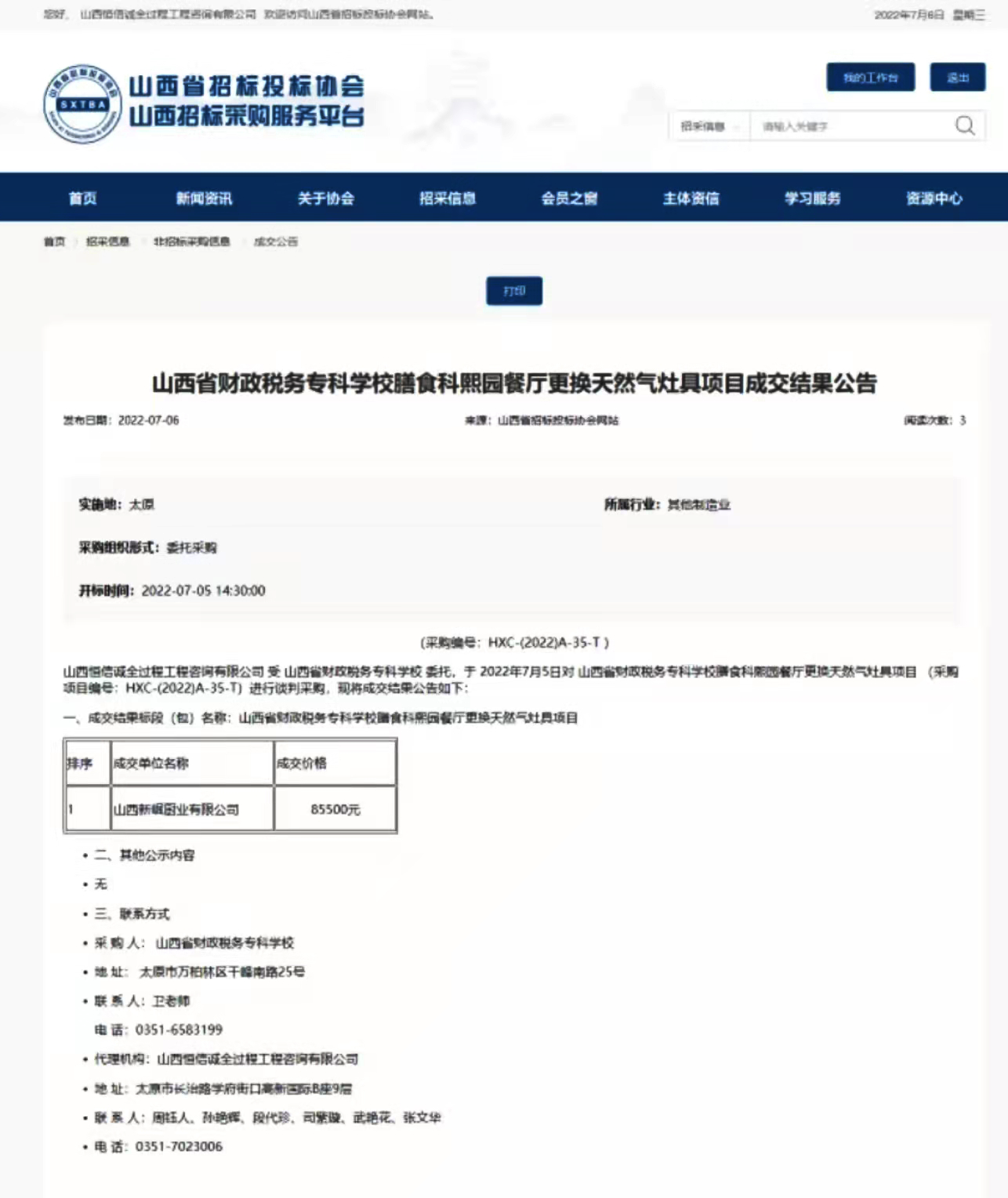 2022年7月6日,山西恒信诚全过程工程咨询有限公司受bat365委托,对bat365“膳食科熙园餐厅更换天然气灶具”项目进行委托采购,并于2022年7月5日组织开标、评标。山西省招标采购服务平台关于本项目成交结果公示如下: