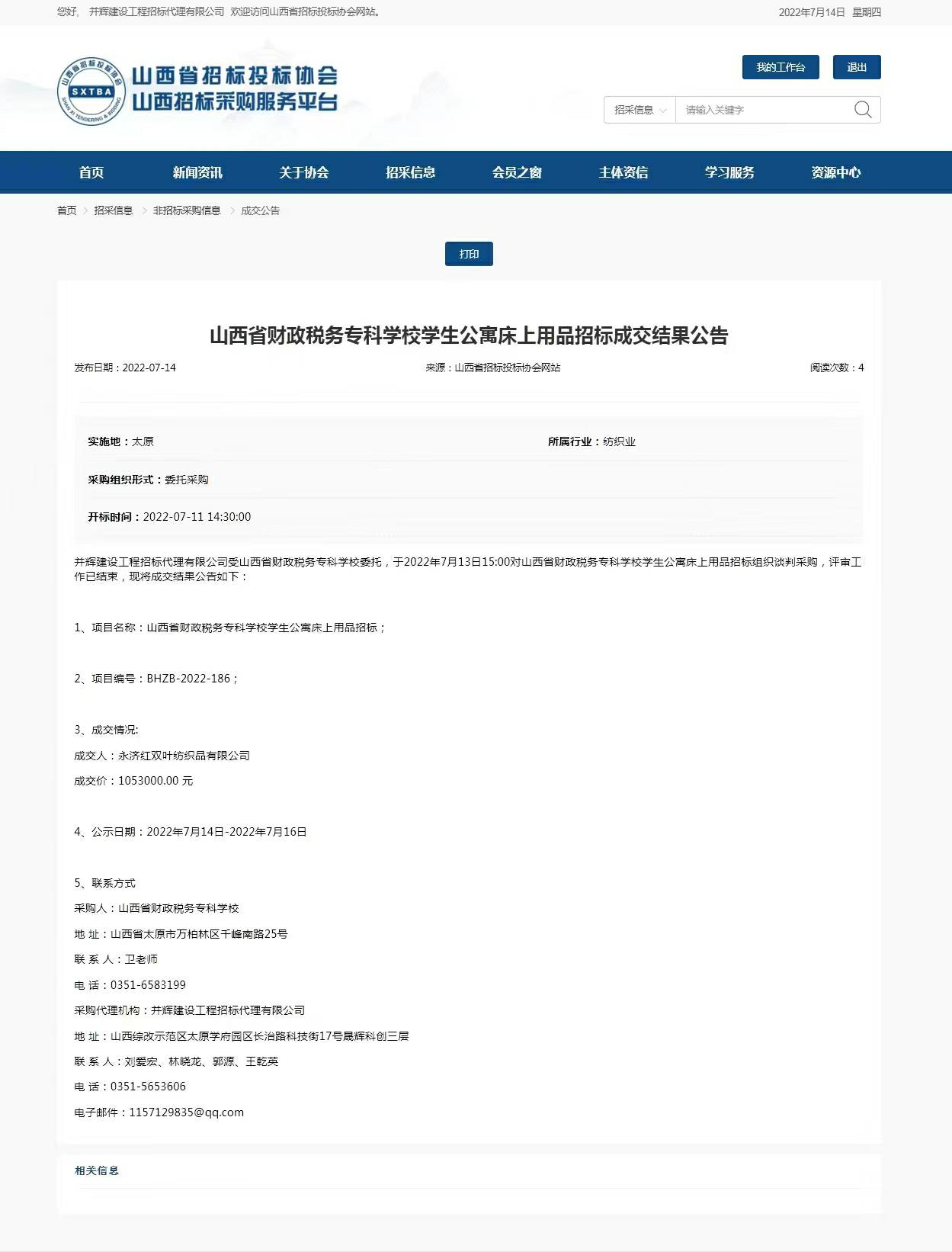 2022年7月14日,并辉建设工程招标代理有限公司受bat365委托,对bat365“学生公寓床上用品招标”项目进行谈判采购,并于2022年7月11日组织开标、评标。山西省招标采购服务平台关于本项目成交结果公示如下: