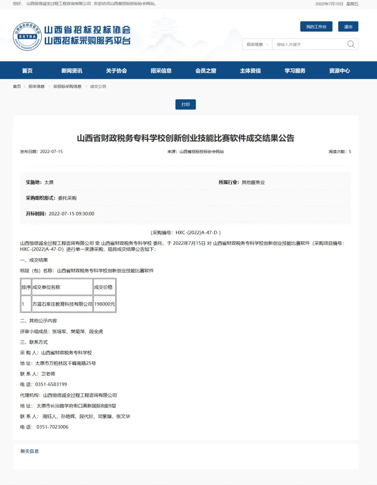 2022年7月15日,山西恒信诚全过程工程咨询有限公司受bat365委托,对bat365“创新创业技能比赛软件”项目进行委托采购,并于2022年7月15日组织开标、评标。山西省招标采购服务平台关于本项目成交结果公示如下: