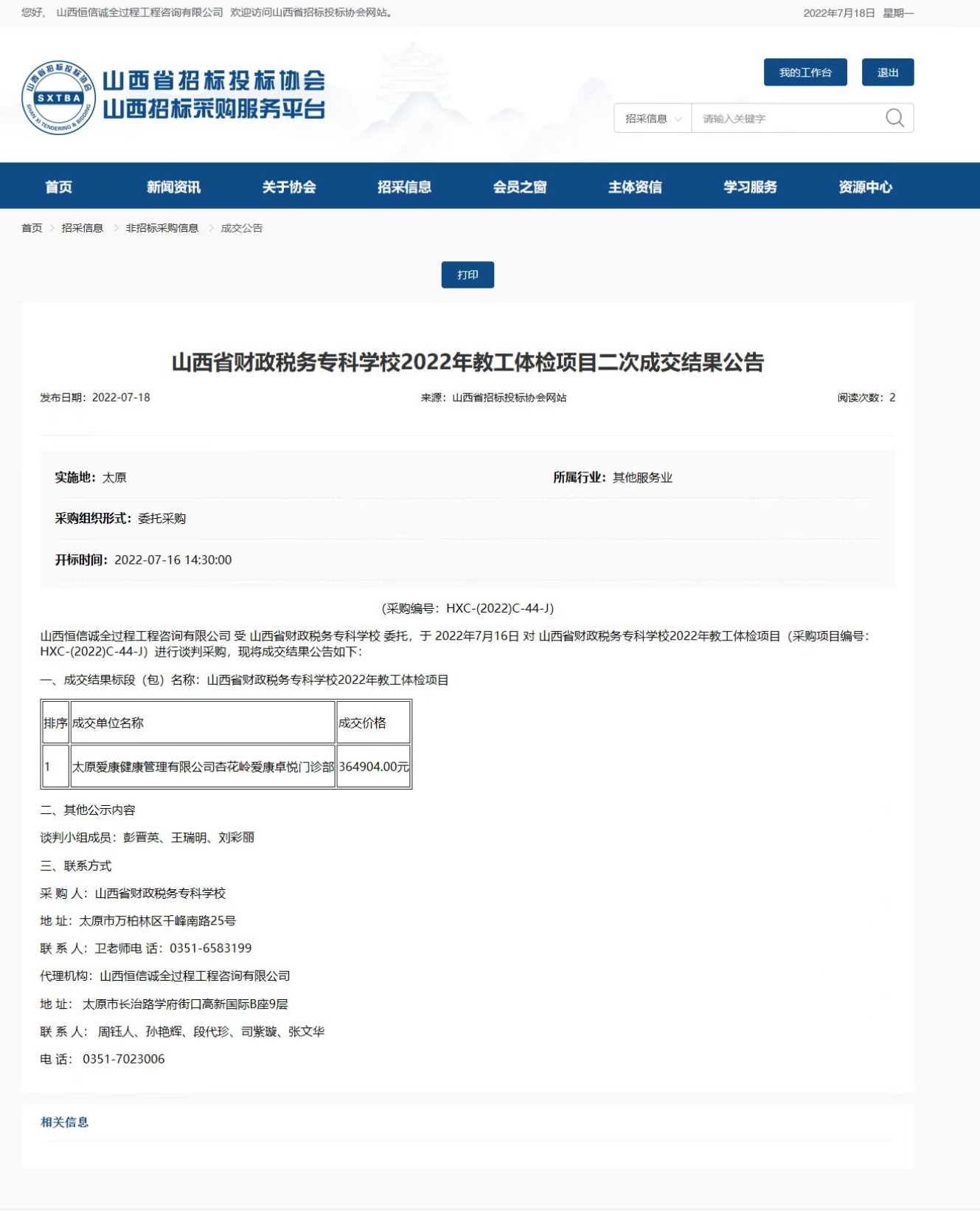 2022年7月18日,山西恒信诚全过程工程咨询有限公司受bat365委托,对bat365“2022年教工体检”项目进行二次委托采购,并于2022年7月16日组织开标、评标。山西省招标采购服务平台关于本项目成交结果公示如下: