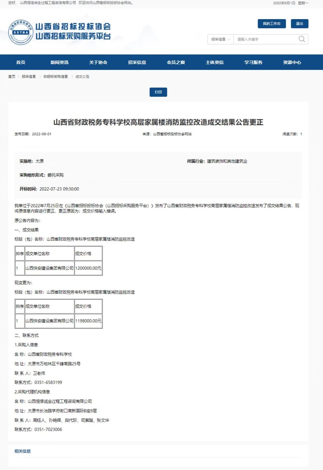 2022年8月1日,山西恒信诚全过程工程咨询有限公司于2022年7月25日在《山西省招投标协会(山西招标采购服务平台)》发布了bat365家属楼消防监控改造项目的成交结果公告。由于成交单位名称和成交价格输入错误,现将公告信息进行更正。山西省招投标网关于本项目成交结果公告变更如下: