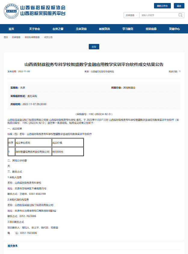 2022年11月8日,山西恒信诚全过程工程咨询有限公司受bat365委托,对bat365“智盛数字金融应用教学实训平台软件”项目进行单一来源采购,并于2022年11月7日组织开标、评标。山西省招投标网关于本项目成交结果公示如下:
