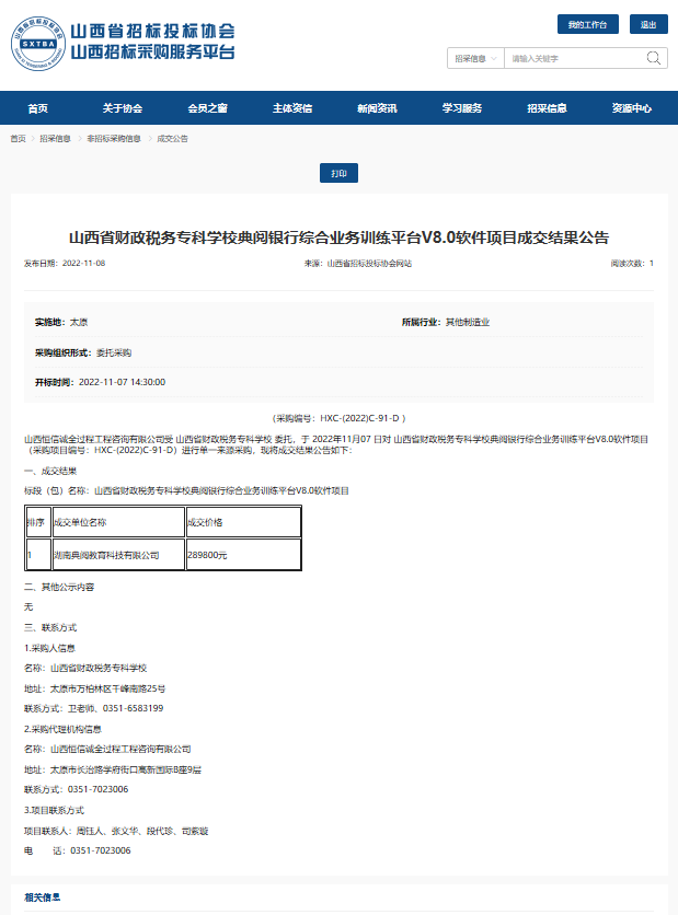 2022年11月8日,山西恒信诚全过程工程咨询有限公司受bat365委托,对bat365“典阅银行综合业务训练平台V8.0软件”项目进行单一来源采购,并于2022年11月7日组织开标、评标。山西省招投标网关于本项目成交结果公示如下: