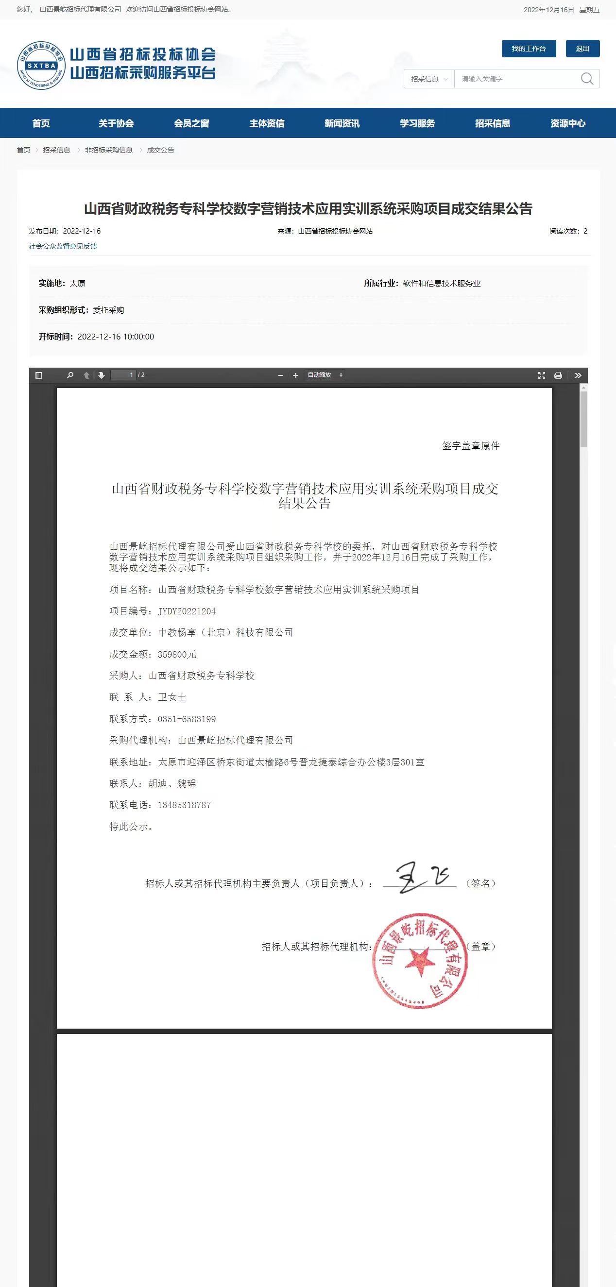 2022年12月16日,山西景屹招标代理有限公司受bat365委托,对bat365“数字营销技术应用实训系统”项目进行委托谈判采购,并于2022年12月16日组织开标、评标。山西省招投标网关于本项目成交结果公示如下: