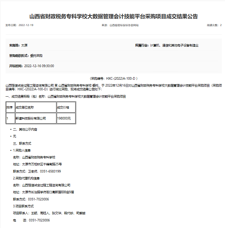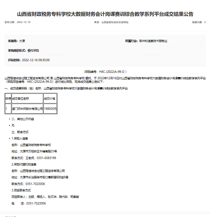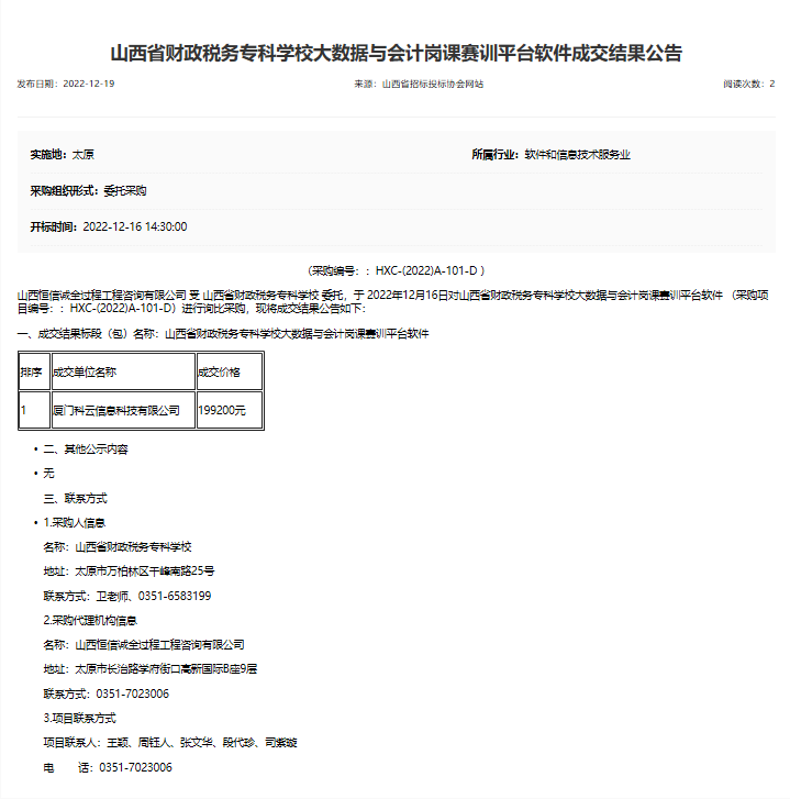 2022年12月19日,山西恒信诚全过程工程咨询有限公司受bat365委托,对bat365“大数据财务会计岗课赛训综合教学系列平台”项目进行询比采购,并于2022年12月16日组织开标、评标。山西省招投标网关于本项目成交结果公示如下: