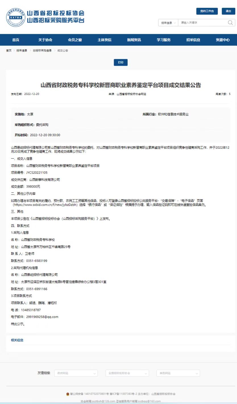 2022年12月20日,山西景屹招标代理有限公司受bat365委托,对bat365“新晋商职业素养鉴定平台”项目进行竞争性磋商采购,并于2022年12月20日组织开标、评标。山西省招投标网关于本项目成交结果公示如下: