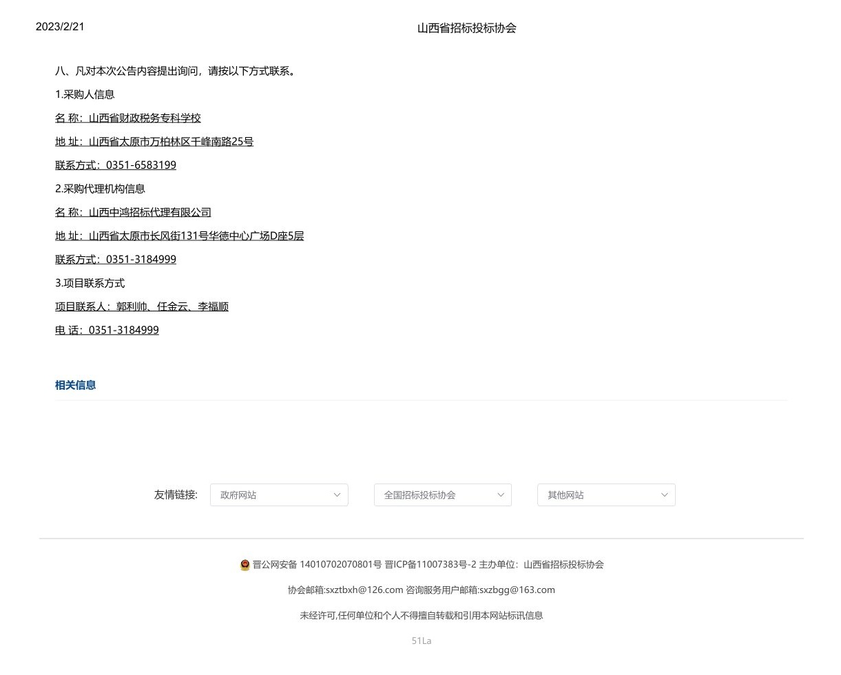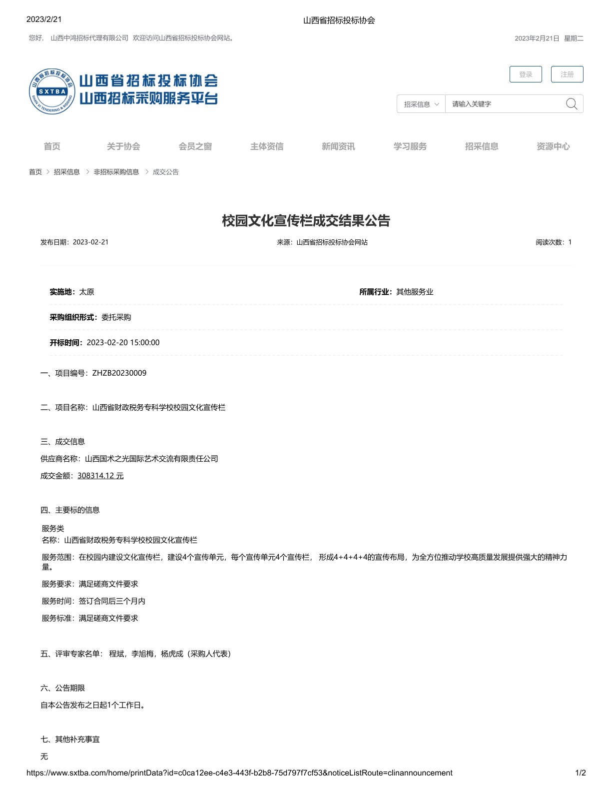 2023年2月21日,山西中鸿招标代理有限公司受bat365委托,对bat365“校园文化宣传栏”项目进行委托招标采购,并于2023年2月20日组织开标、评标。山西省招投标网关于本项目成交结果公示如下: