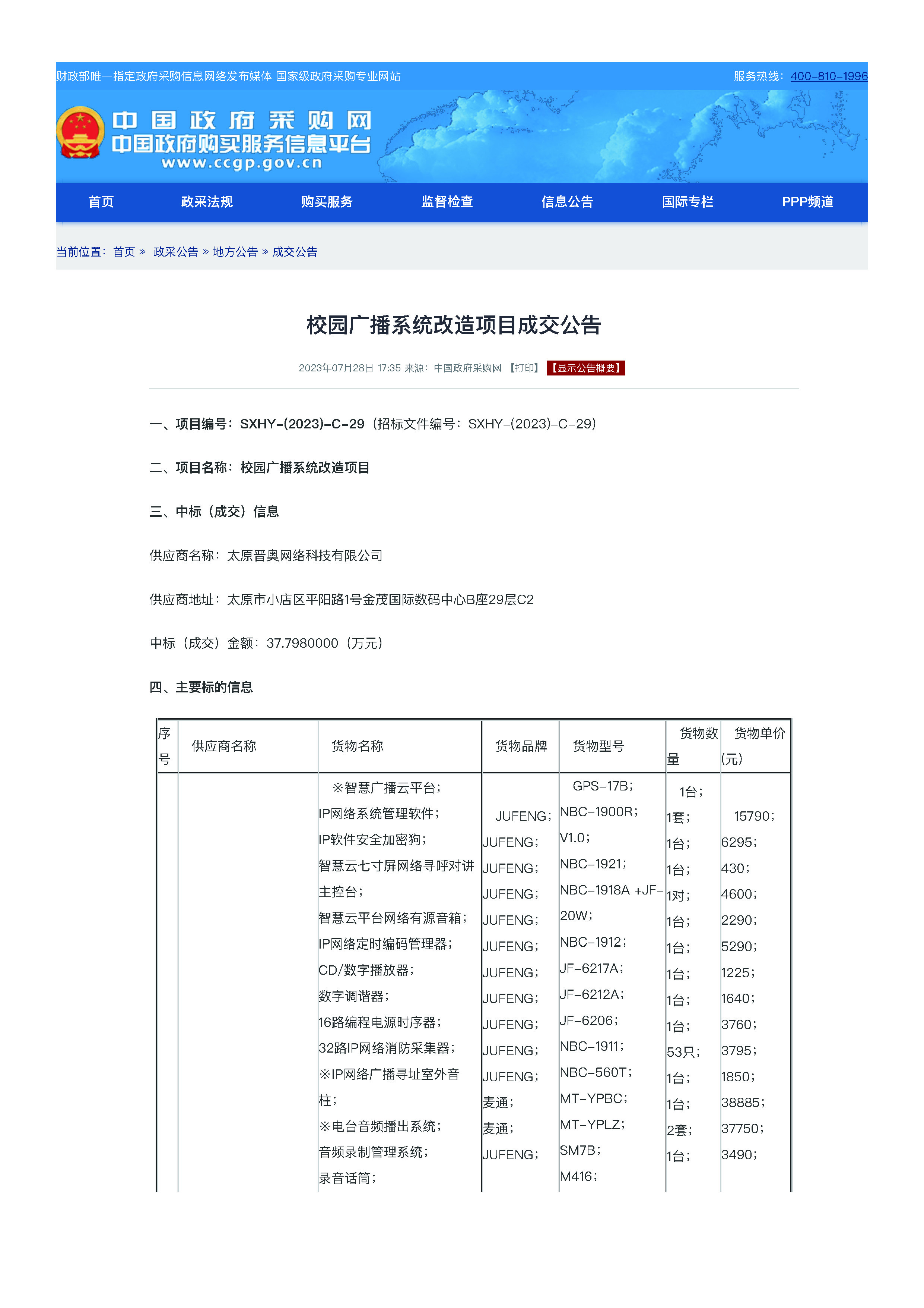 2023年7月28日,山西恒运招标代理有限公司受bat365委托,对bat365“校园广播系统改造”项目进行招标采购,并于2023年7月28日组织开标、评标。山西省政府采购网关于本项目成交结果公示如下: