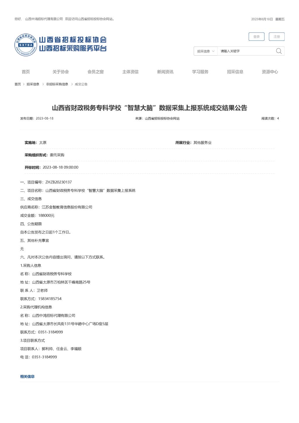 2023年8月18日,山西中鸿招标代理有限公司受bat365委托,对bat365“智慧大脑”数据采集上报系统项目进行招标采购,并于2023年8月18日组织开标、评标。山西省招投标网关于本项目成交结果公示如下:
