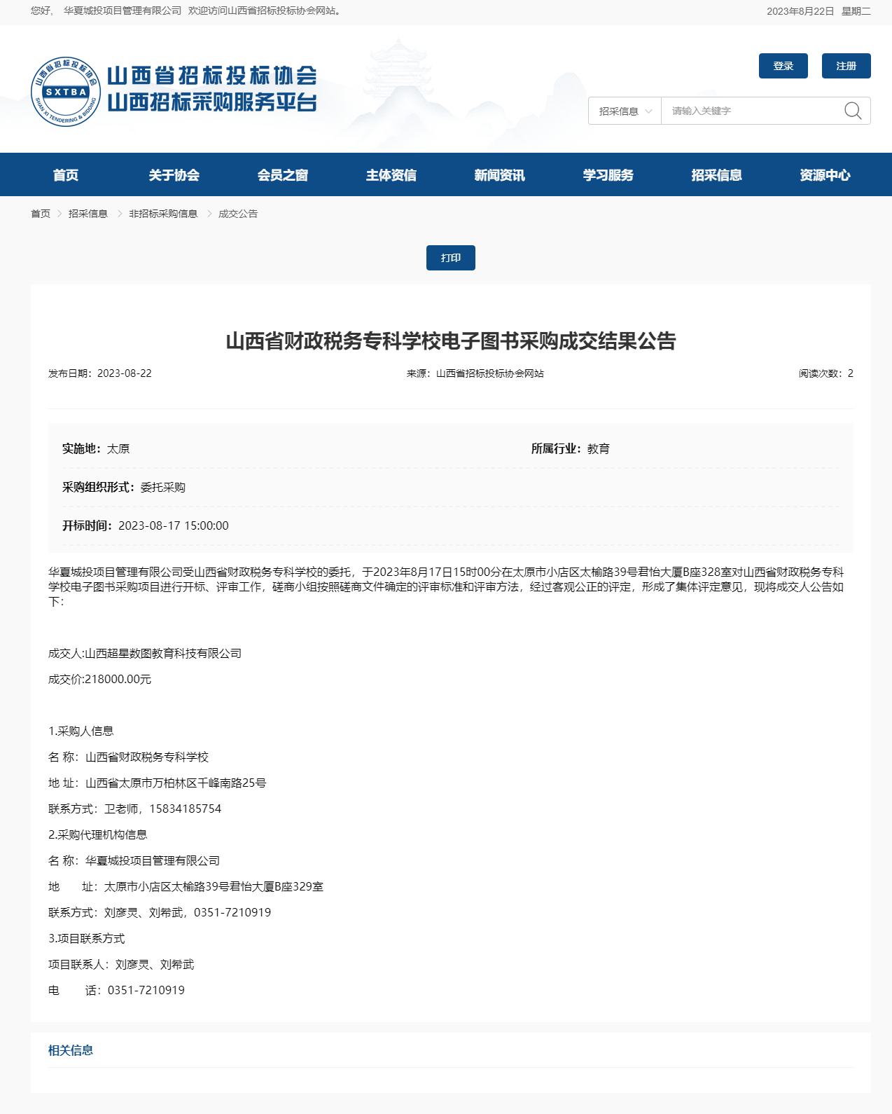 2023年8月22日,华夏城投项目管理有限公司受bat365委托,对bat365“电子图书采购”项目进行招标采购,并于2023年8月17日组织开标、评标。山西省招投标网关于本项目成交结果公示如下: