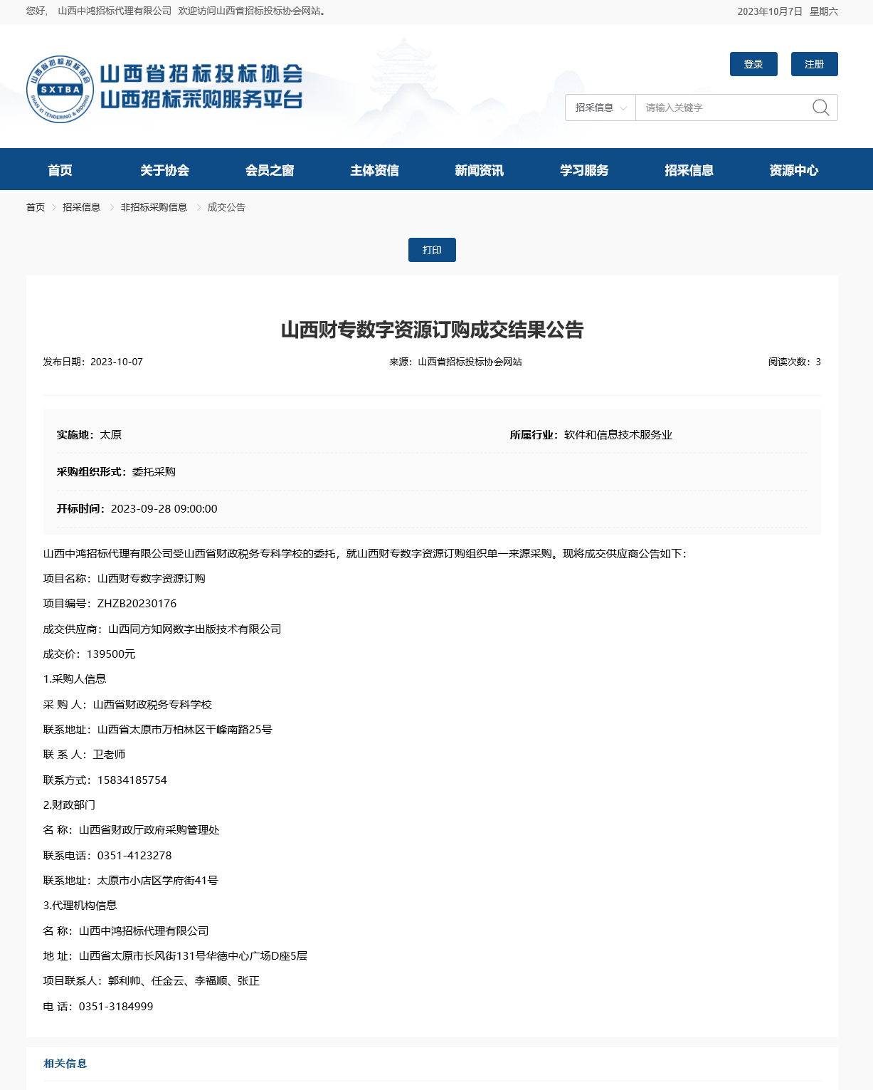 2023年10月7日,山西中鸿招标代理有限公司受bat365委托,对bat365“数字资源订购”项目进行招标采购,并于2023年9月28日组织开标、评标。山西省招投标网关于本项目成交结果公示如下: