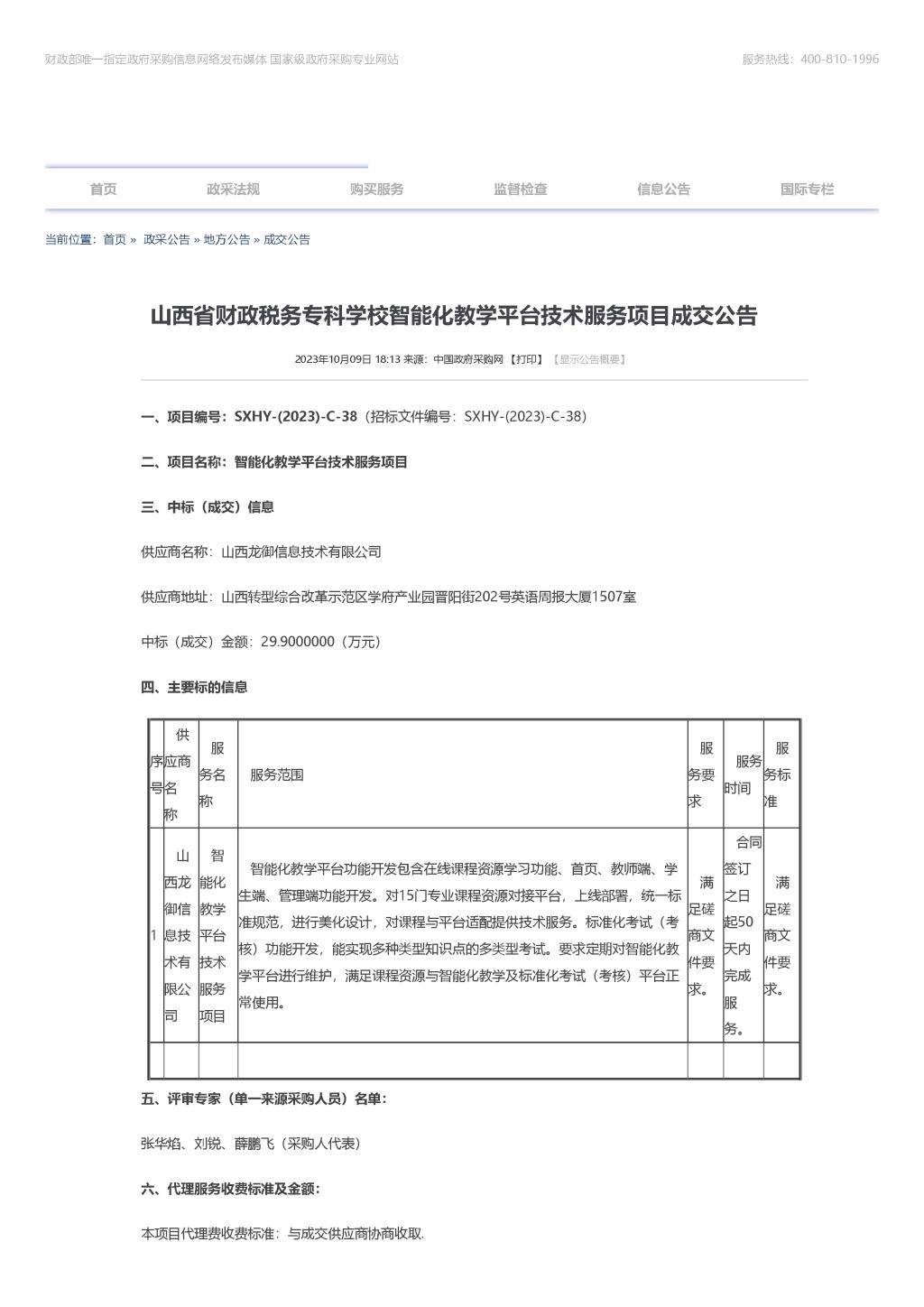 2023年10月9日,山西恒运招标代理有限公司受bat365委托,对bat365“智能化教学平台技术服务”项目进行招标采购,并于2023年10月9日组织开标、评标。山西省政府采购网关于本项目公告如下: